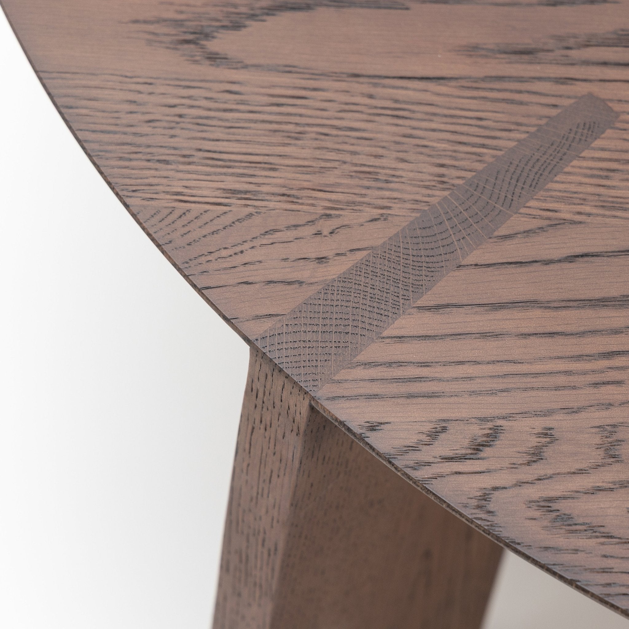 "كايل" كلمة نرويجية تعني "إسفين"، وهي تقنية ربط استخدمها ستاين آس ببراعة في طاولة القهوة الخشبية البسيطة هذه. تبدو أرجل الطاولة الأربعة، الشبيهة بالألواح، وكأنها تتقاطع مع سطح الطاولة الدائري بزوايا مختلفة، وهي ميزة تتجلى في التقاء حبيبات الخشب.