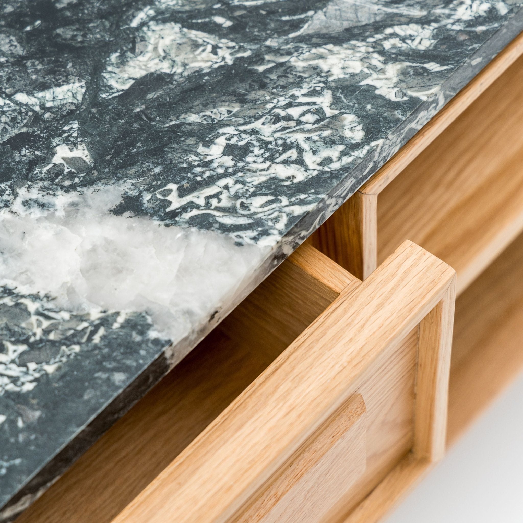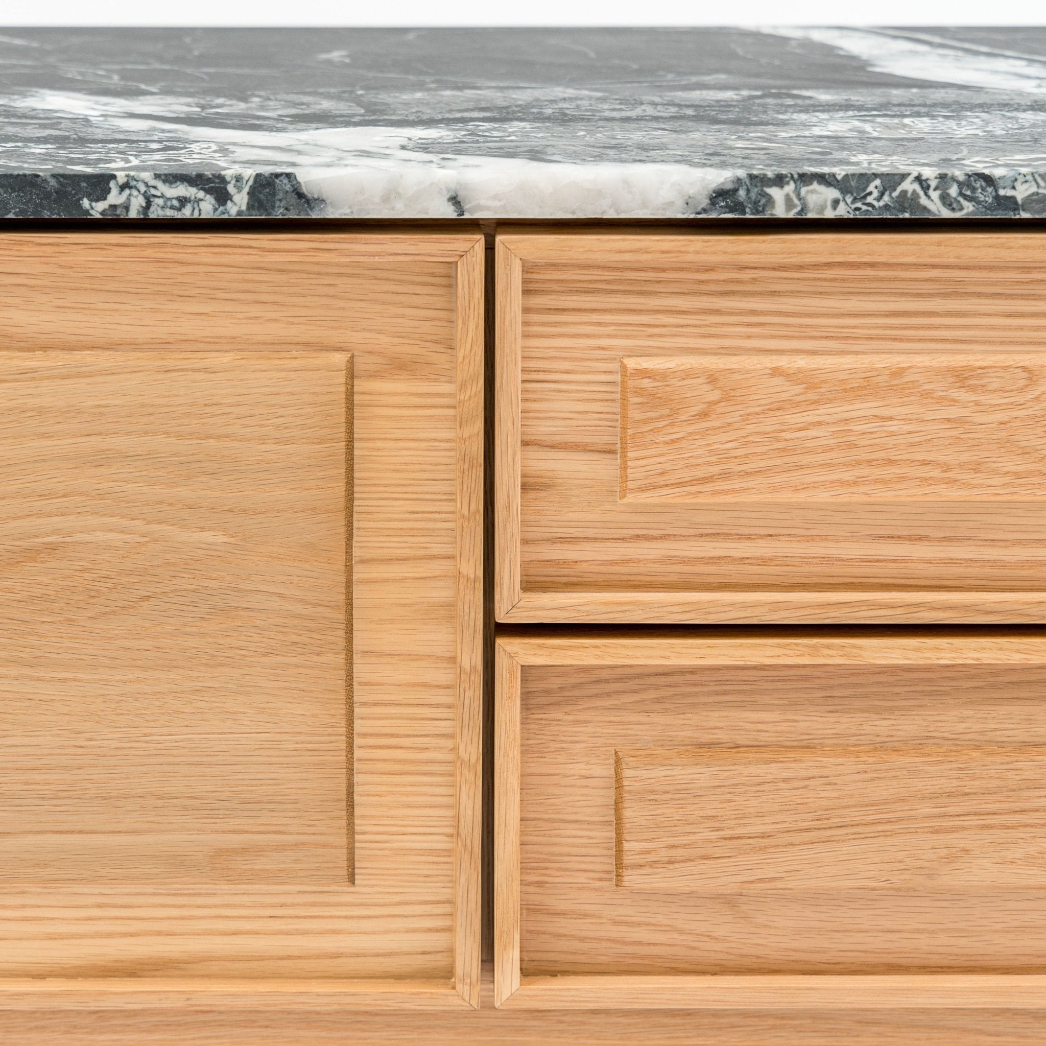 تتميز خزائن Yorke بضمان التناسق الهادئ. إن الزخارف المزخرفة على الواجهات، والتي تربط الماضي بالحاضر دون عناء، هي التفصيلة الزخرفية الوحيدة على شكل خطي بسيط، والذي يرتكز بشكل جيد على أبعاد مدروسة. اختر من بين خشب البلوط الصلب أو الحجر الطبيعي للوحة العلوية.