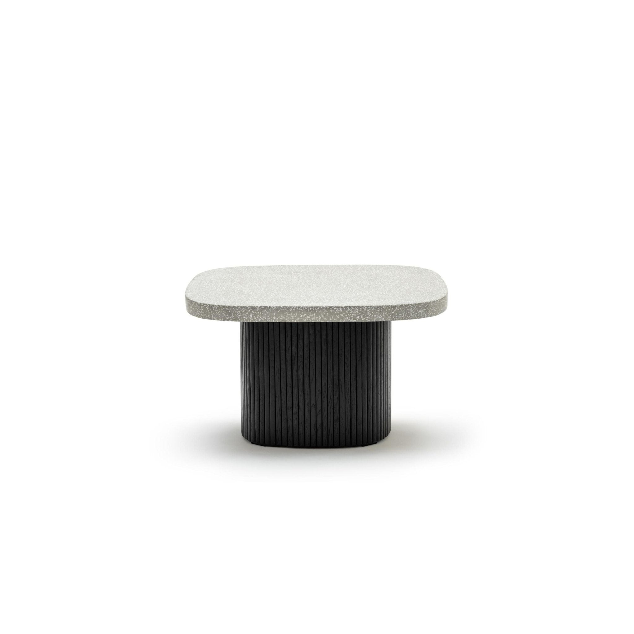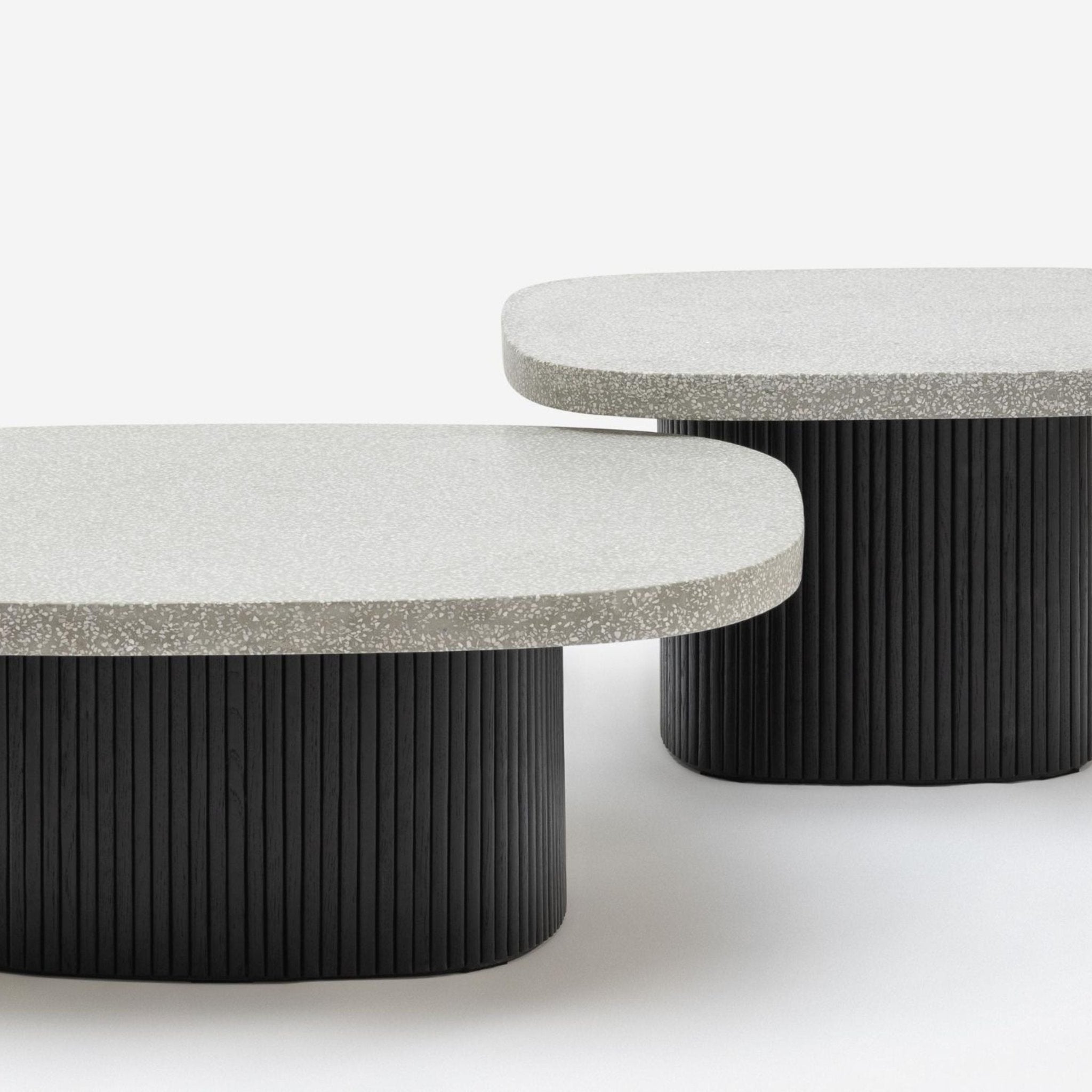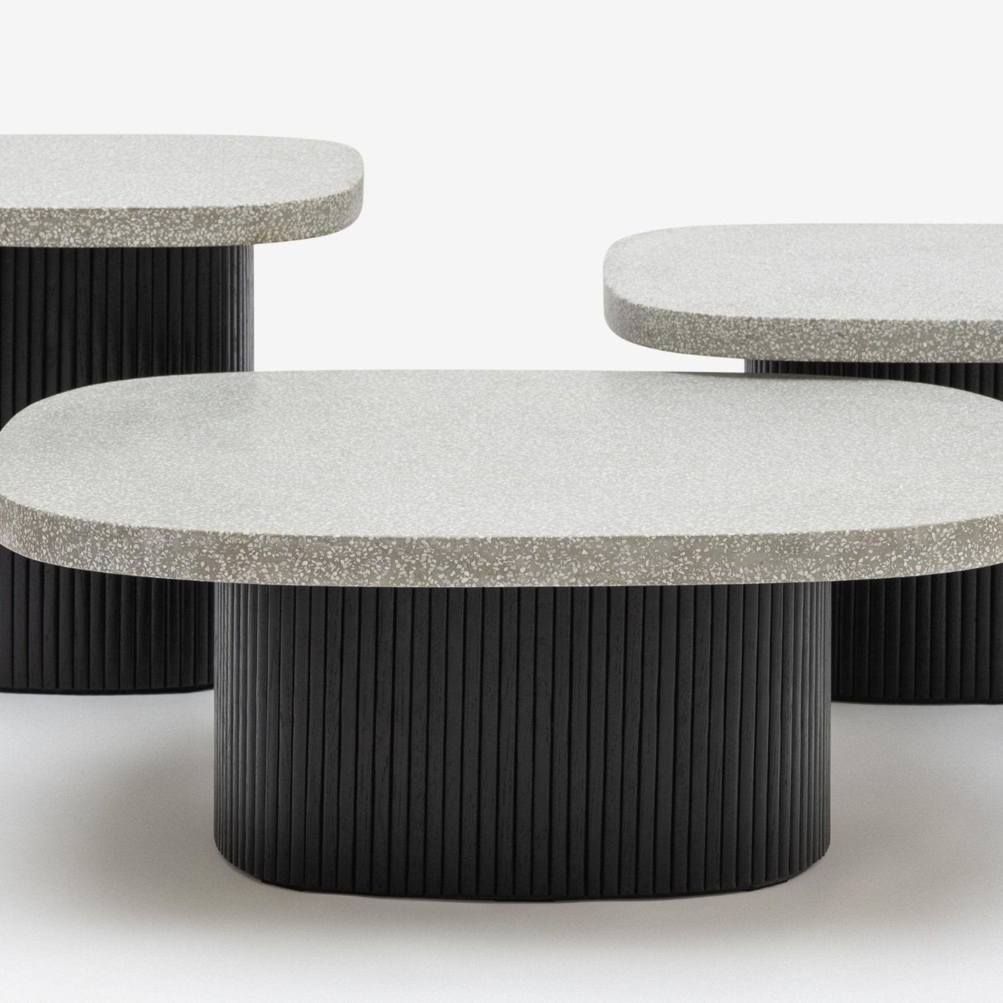 إن الهيكل الخشبي المضلع لقاعدة طاولة جيون مستوحى من سمة معمارية لبيوت الشاي الموجودة في شوارع جيون في كيوتو. يتناقض الترتيب المنظم للأضلاع الخشبية بشكل جميل مع الترتيب الأكثر عشوائية للأحجار التي تشكل سطح التيرازو. تبدو طاولات القهوة رائعة بمفردها أو يمكن تداخلها مع الحجمين الآخرين لإنشاء مشهد طاولة قهوة متداخلة.