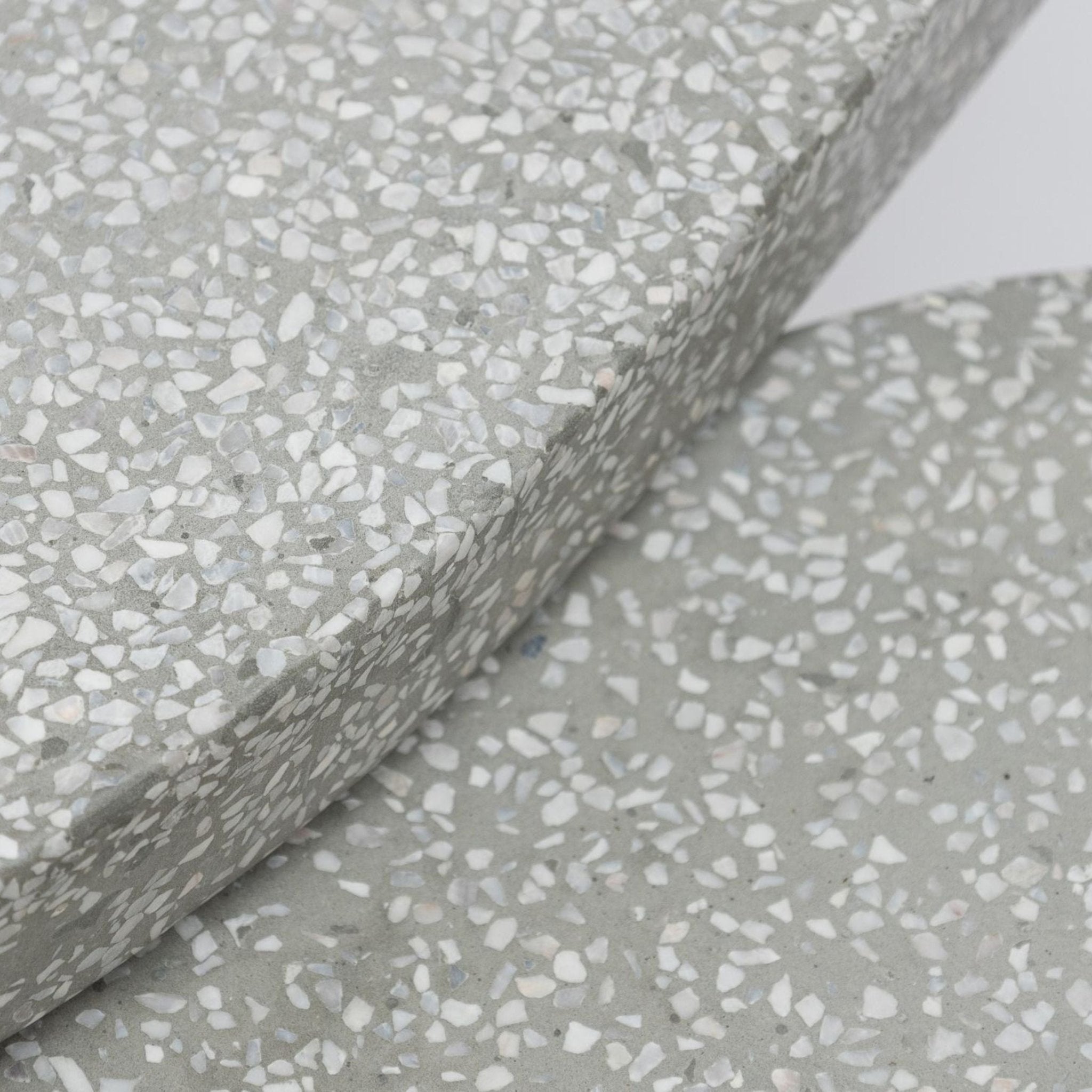 مصنوعة بشكل مستدام من خشب البلوط الصلب المعتمد وقطعة علوية مصنوعة يدويًا من حجر Terrazzo.