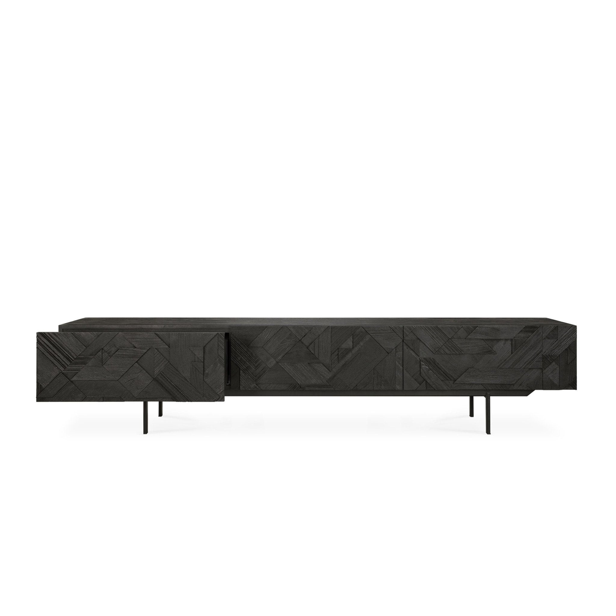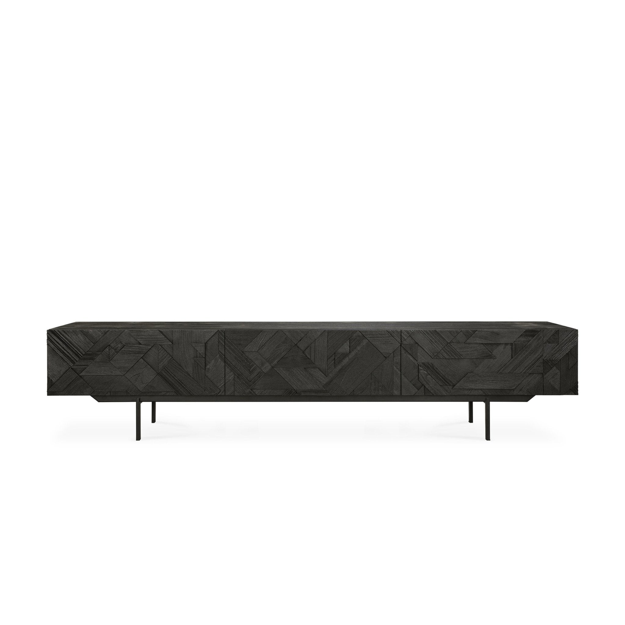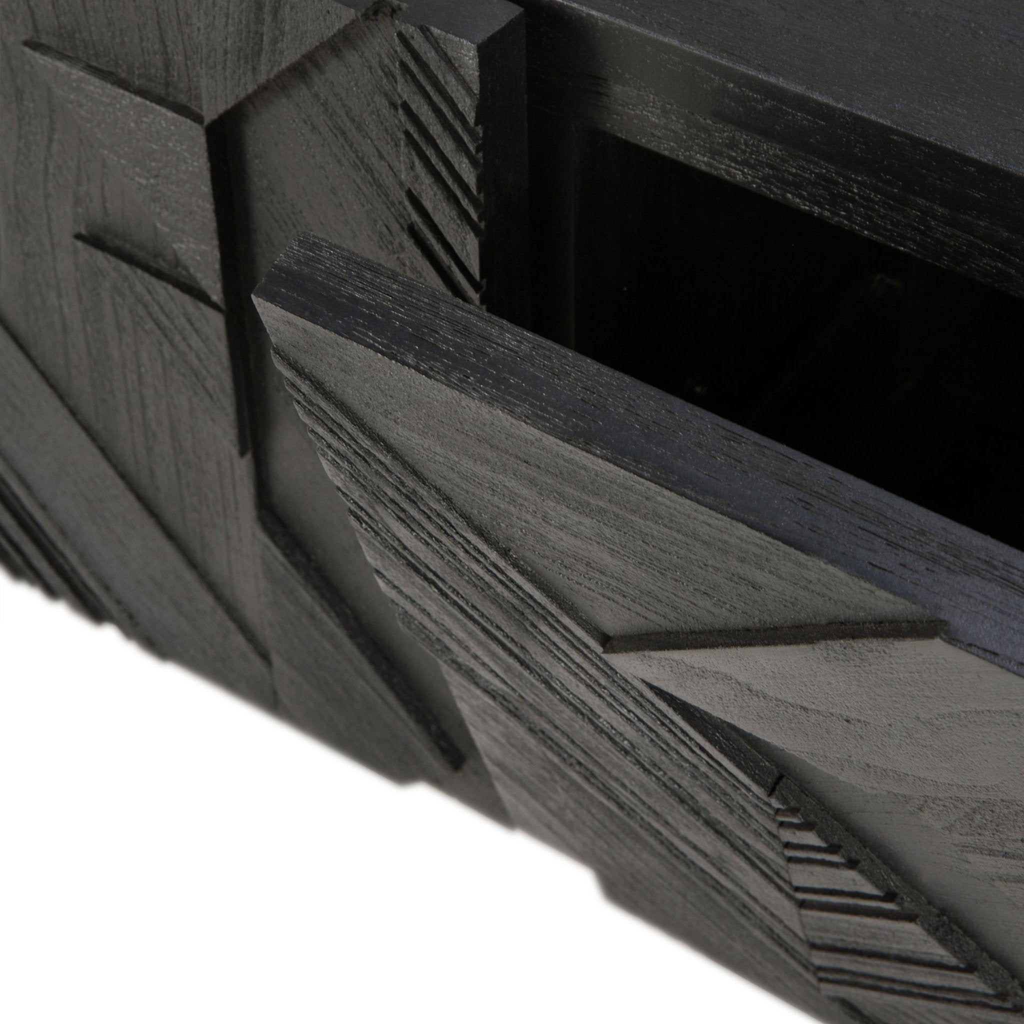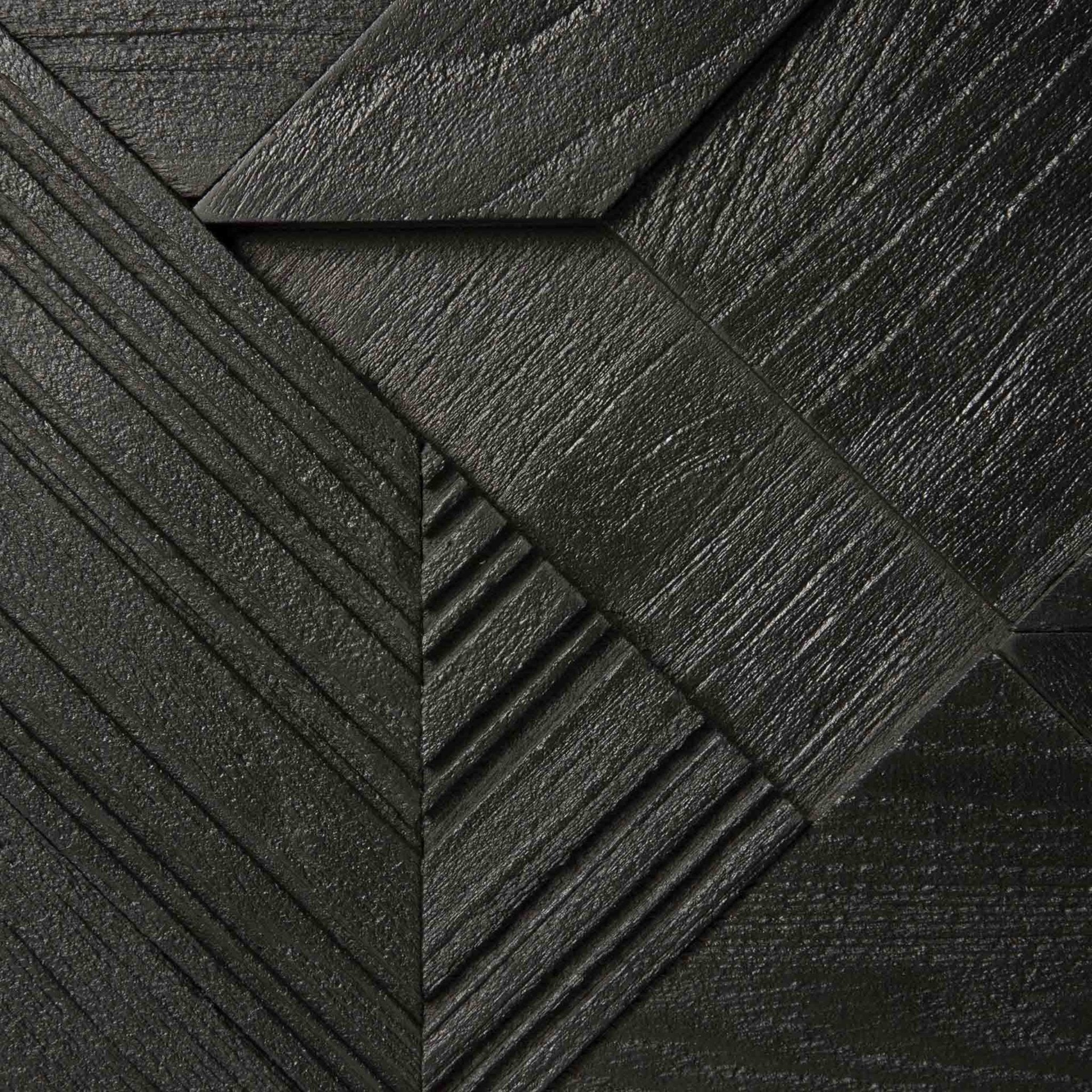 في سعيه لإضافة الحركة إلى السطح، بدأ مصممنا ألان فان هافر في وضع طبقات ودمج الأشكال المثلثية. وقبل أن يدرك ذلك، كان قد ابتكر تركيبة مثيرة للاهتمام من خشب الساج. وانتهى بنا الأمر بتنظيف السطح بالفرشاة لإبراز الحبوب والتأكيد بشكل أكبر على الشعور بالحركة. وقد استُخدم هذا النمط في الأصل في خزانة جانبية Teak Graphic الشهيرة لدينا، والآن يمكن ترجمته بشكل مثالي إلى خزانة تلفزيون جديدة.