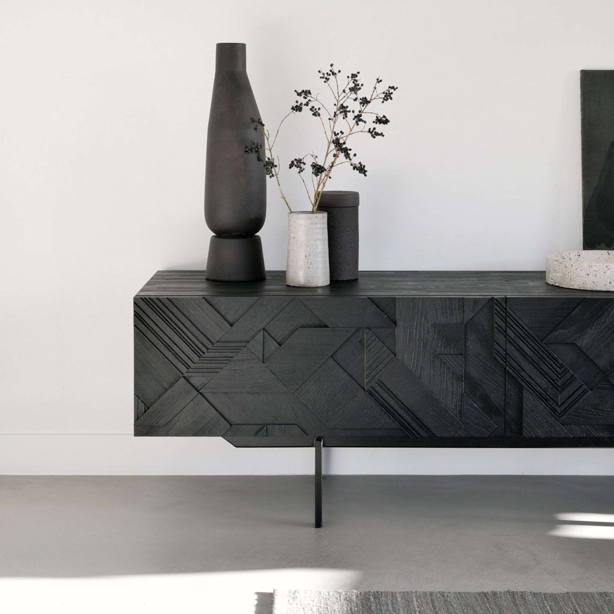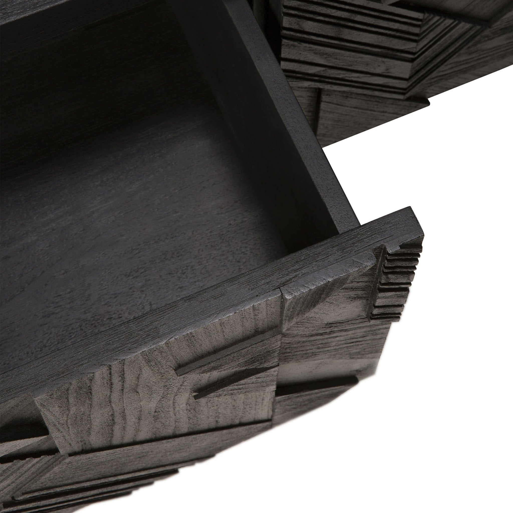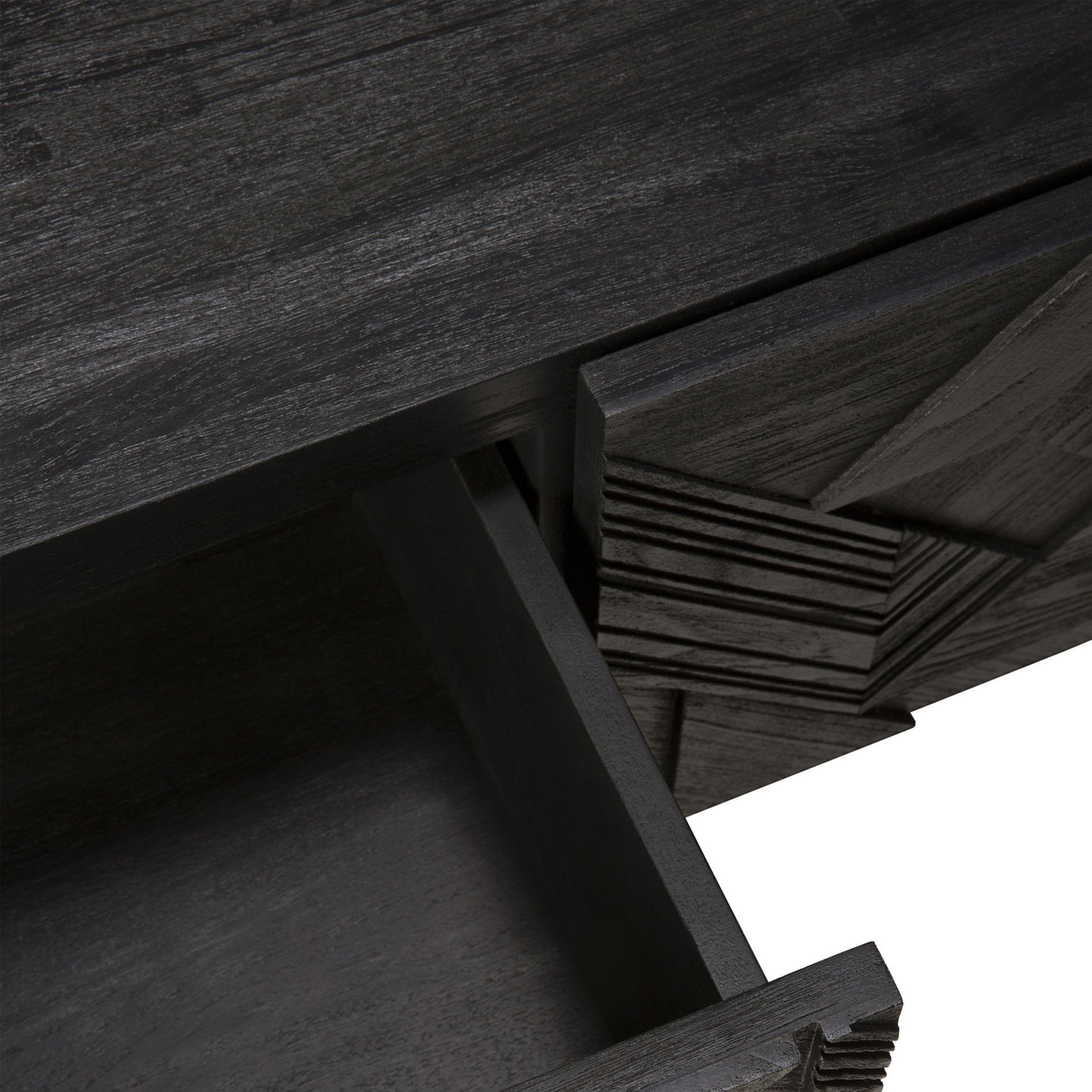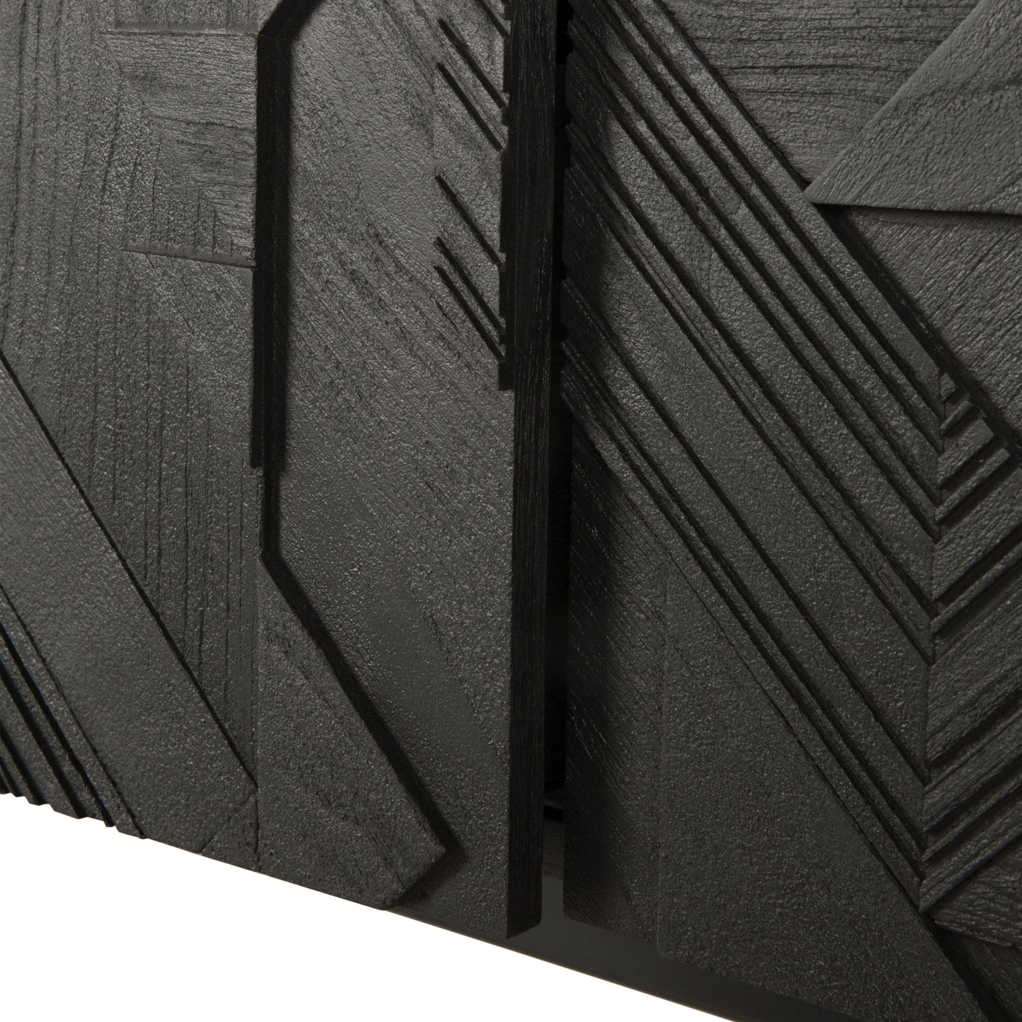 في سعيه لإضافة الحركة إلى السطح، بدأ مصممنا ألان فان هافر في وضع طبقات ودمج الأشكال المثلثية. وقبل أن يدرك ذلك، كان قد ابتكر تركيبة مثيرة للاهتمام من خشب الساج. وانتهى بنا الأمر بتنظيف السطح بالفرشاة لإبراز الحبوب والتأكيد بشكل أكبر على الشعور بالحركة. وقد استُخدم هذا النمط في الأصل في خزانة جانبية Teak Graphic الشهيرة لدينا، والآن يمكن ترجمته بشكل مثالي إلى خزانة تلفزيون جديدة.