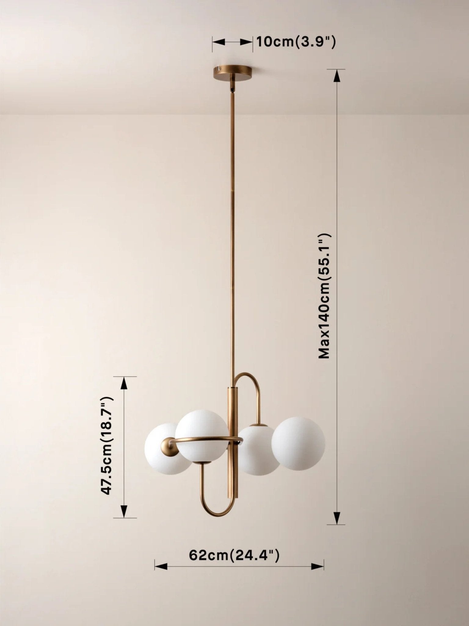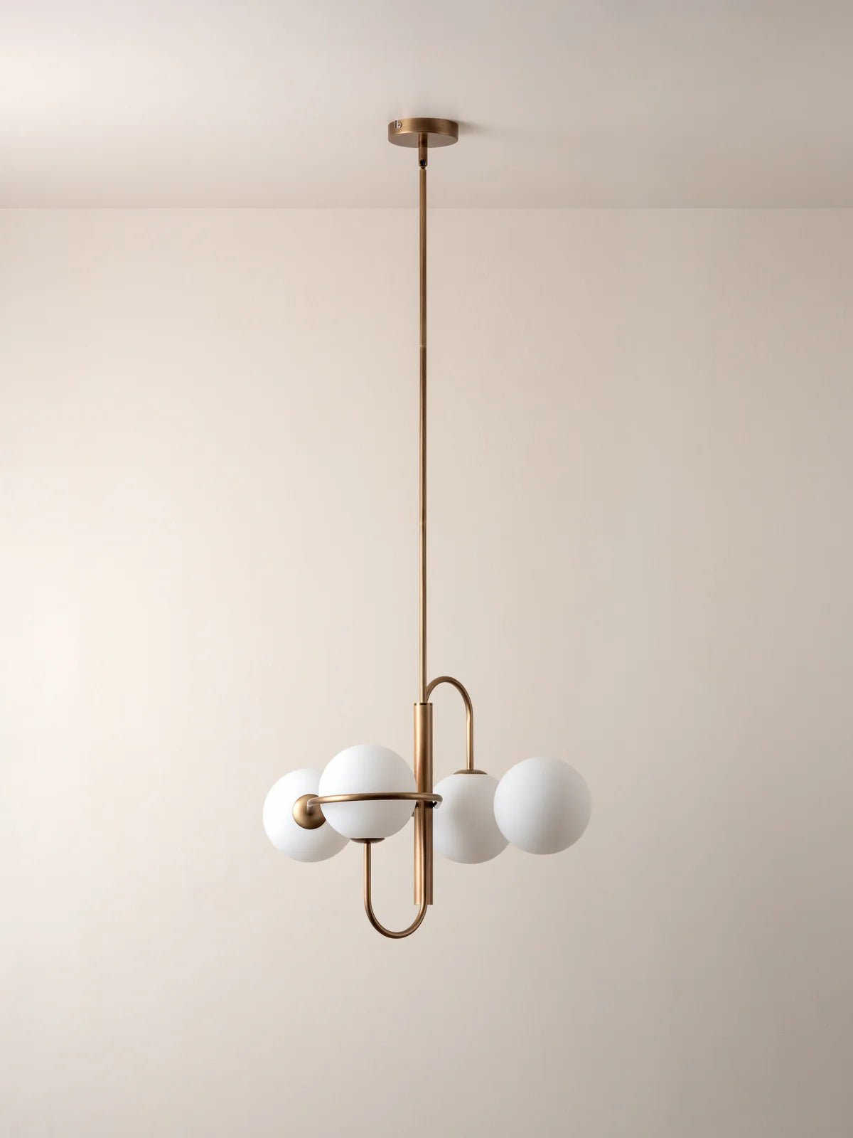 أنيق ومرح. يتميز مصباح ديكورا المعلق بأربع قباب من العقيق الأبيض الحليبي، تبرز بأناقة من ذراع نحاسي مركزي. تُصدر الكرات المميزة ضوءًا ناعمًا وهادئًا، مما يخلق أجواءً دافئة وجذابة، بينما يتيح لك الساق المركزي القابل للتعديل تعديل طوله ليناسب أي ارتفاع للسقف - خيار متعدد الاستخدامات يناسب مختلف أنماط الديكور الداخلي أو أنواع المباني دون أن يُثقل كاهل التصميم.