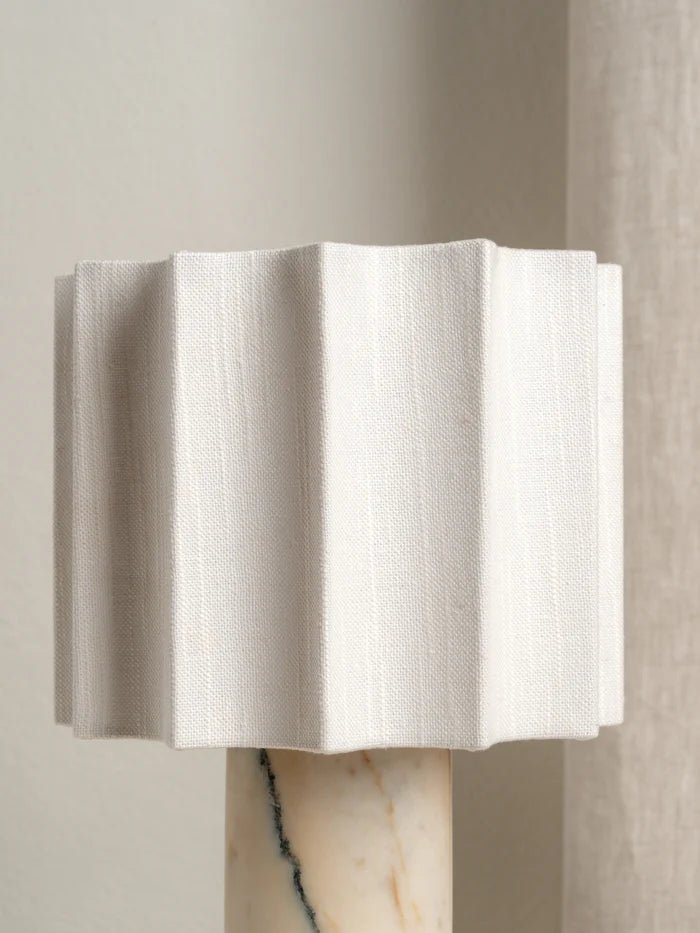 هل هذا أرقى مصباح رأيته على الإطلاق؟ يتميز مصباح طاولة فالي بغطاء جميل مصنوع يدويًا من الكتان الأبيض، ذو شكل صدفي مقعر. وإذا لم يكن هذا كافيًا، فهو يقع فوق أسطوانة رائعة من رخام فيولا كالاكاتا الإيطالي المصقول.
