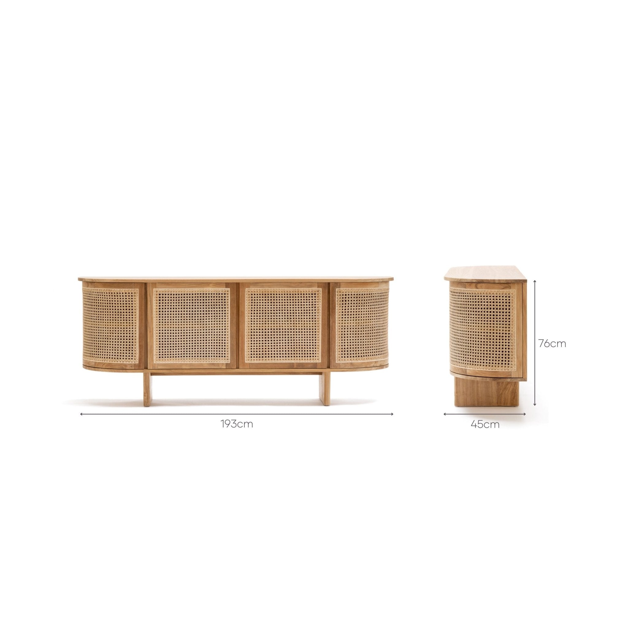 أضف لمسةً من الأجواء البالينية مع خزانة "كالي كيرف" الجانبية المصنوعة من خشب الساج المصمت وشبكة من الروطان الطبيعي. جوانبها المستديرة تُضفي نعومةً على المكان وتتيح مساحة تخزين واسعة بفضل أربعة أبواب تفتح بالكامل ورفوف داخلية.