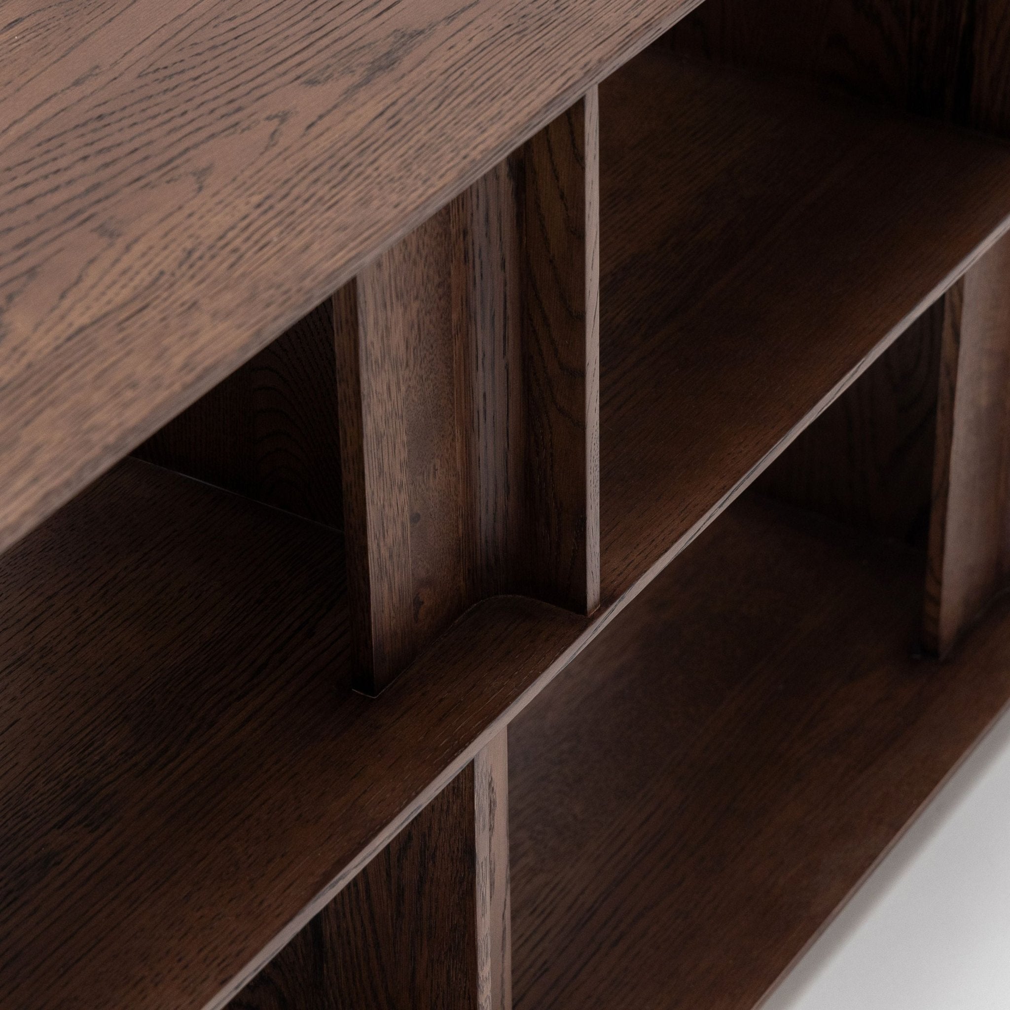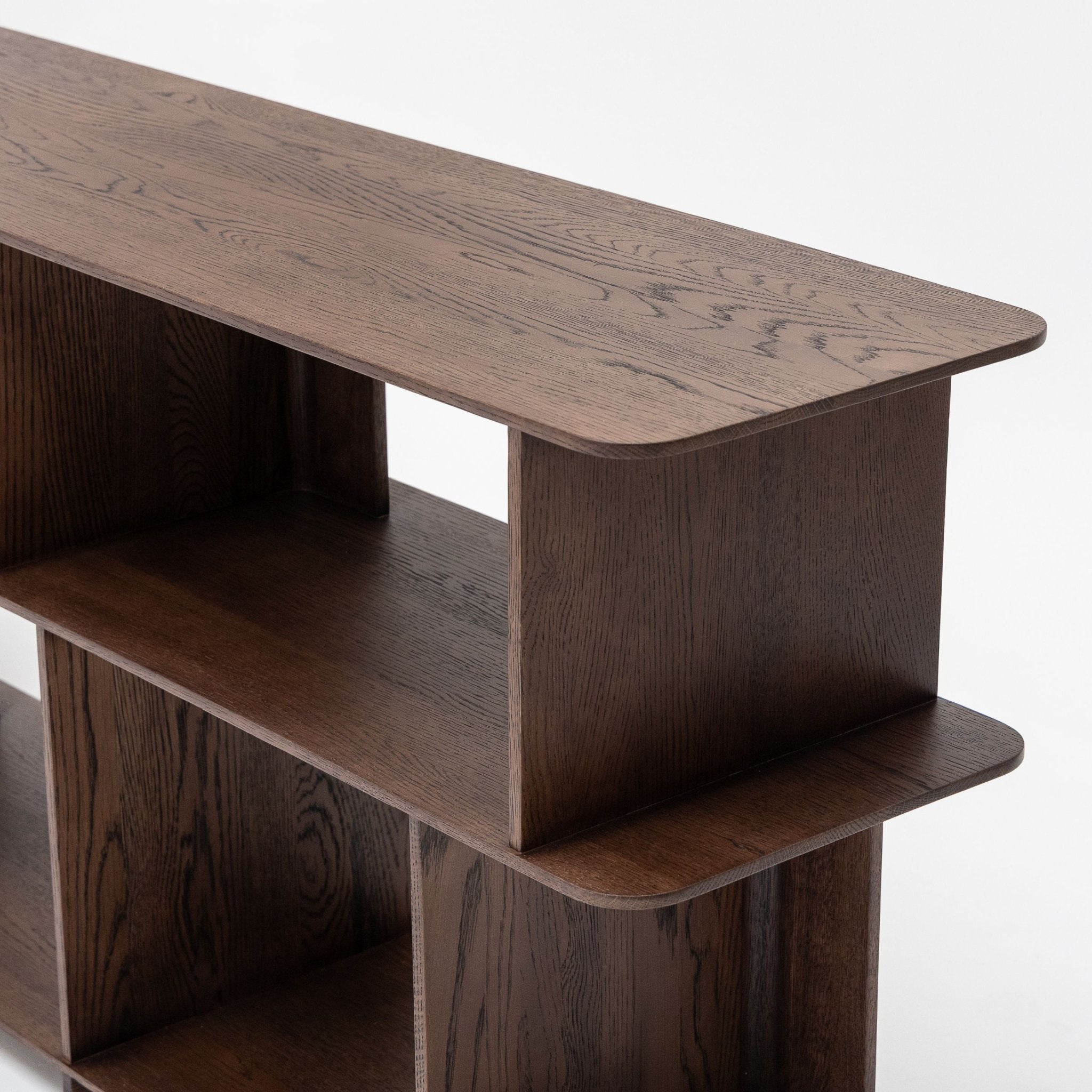 تتقاطع الألواح العمودية لتشكيل القوائم، والتي عند ترتيبها في اتجاهات متناوبة، تخلق شعورًا بالحركة وتكسر التناظر، بينما تقدم أيضًا خيارات عرض وتخزين مثيرة للاهتمام.