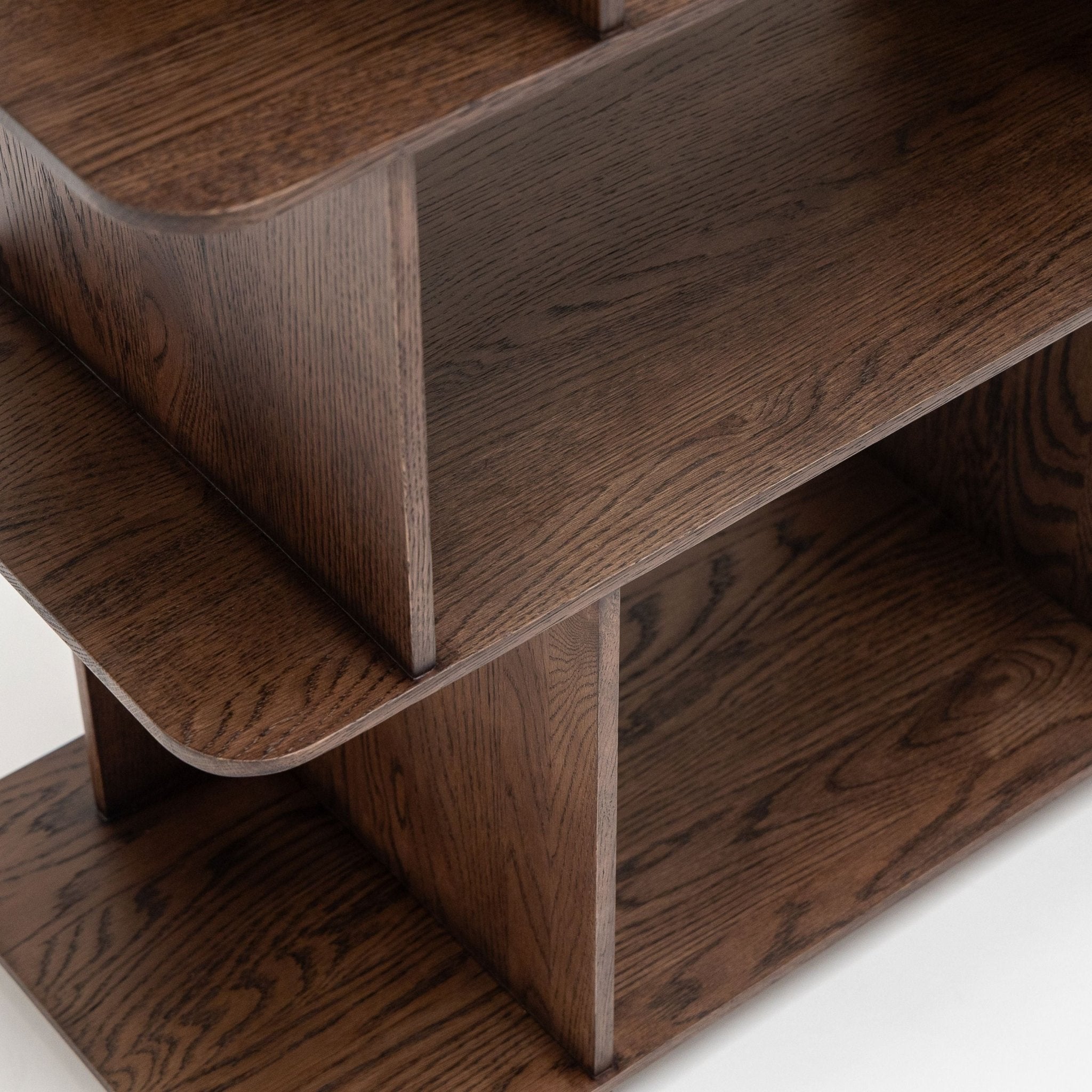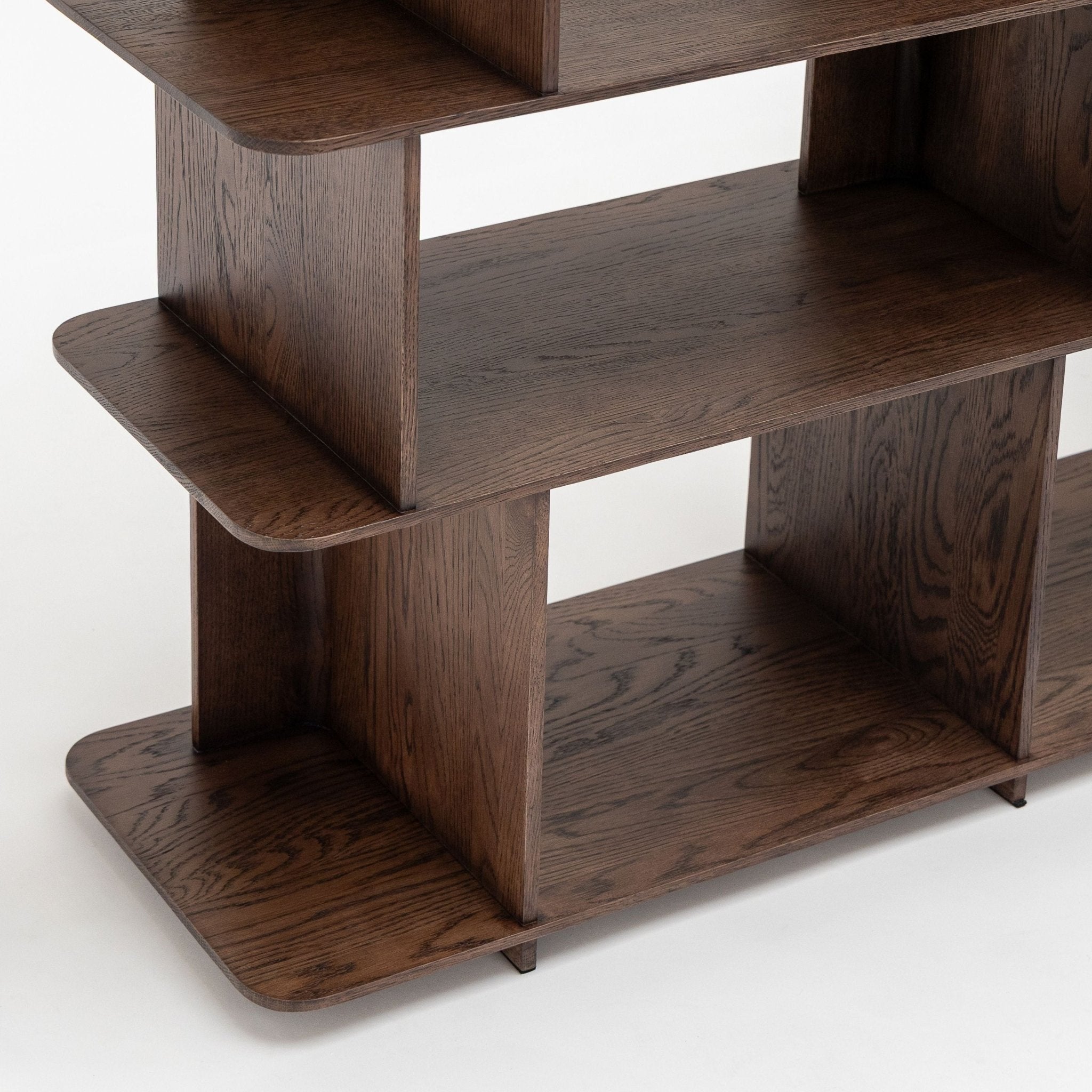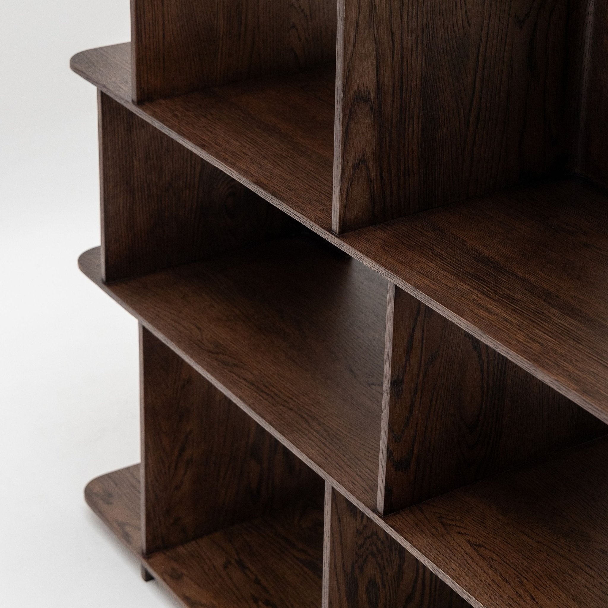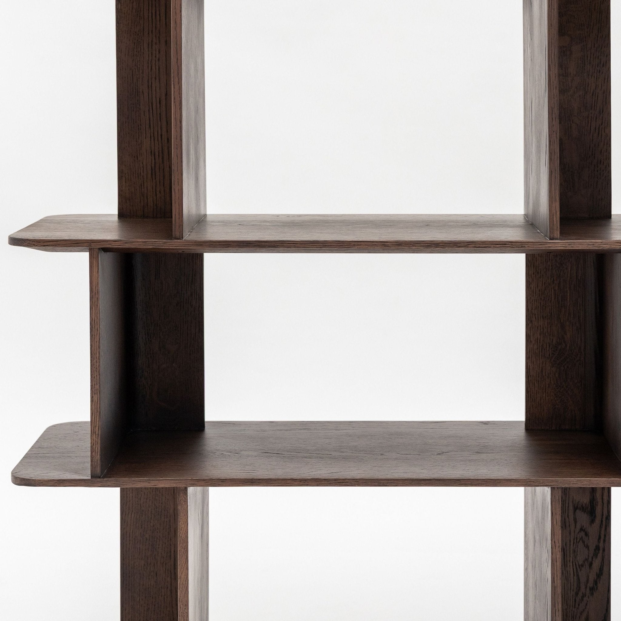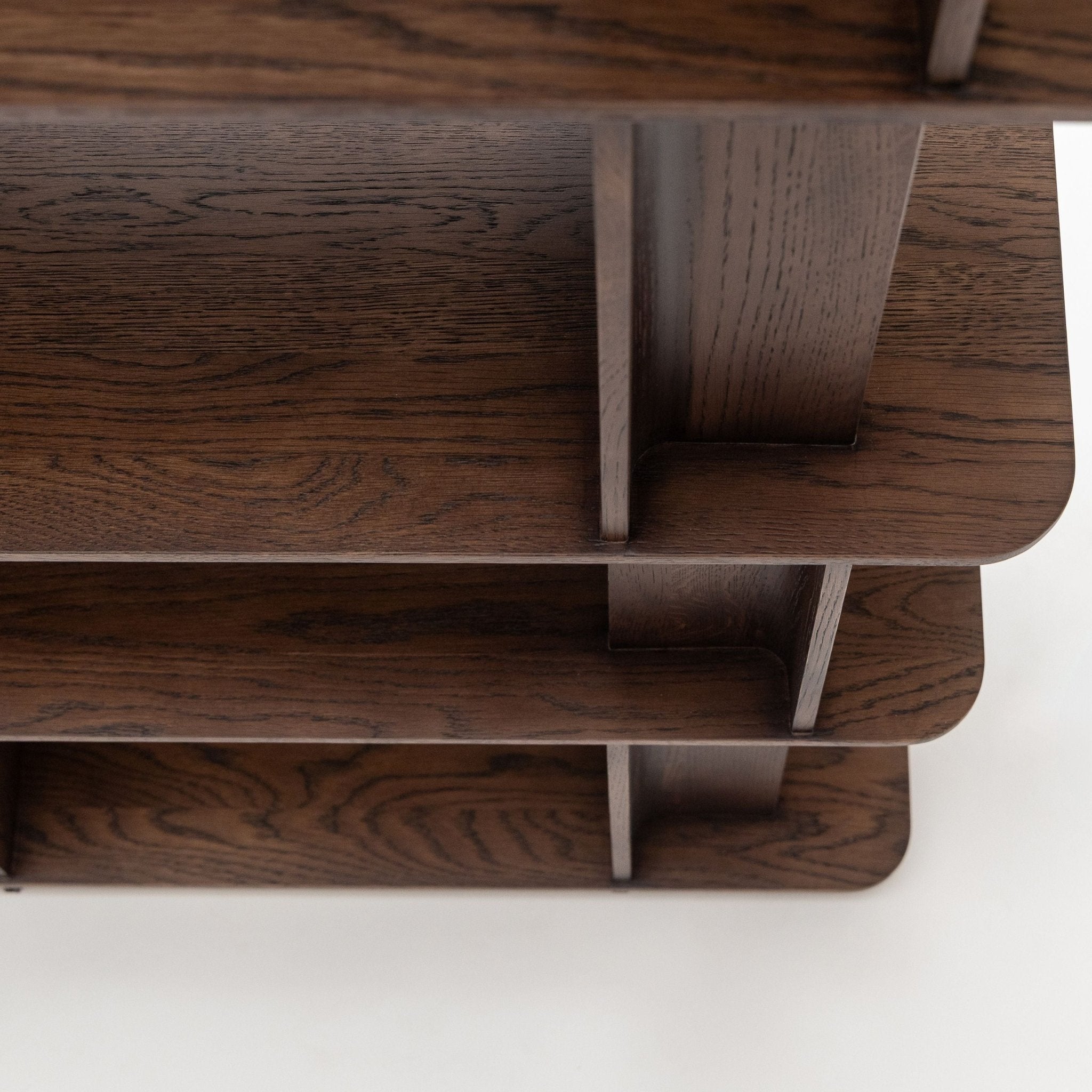 Perpendicular panels intersect to form the uprights, which, arranged in alternating directions, create a feeling of movement and break up the symmetry, while also offering interesting display and storage options.