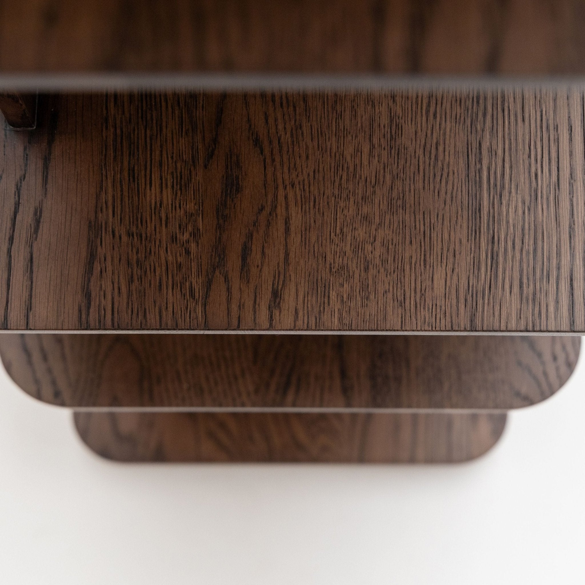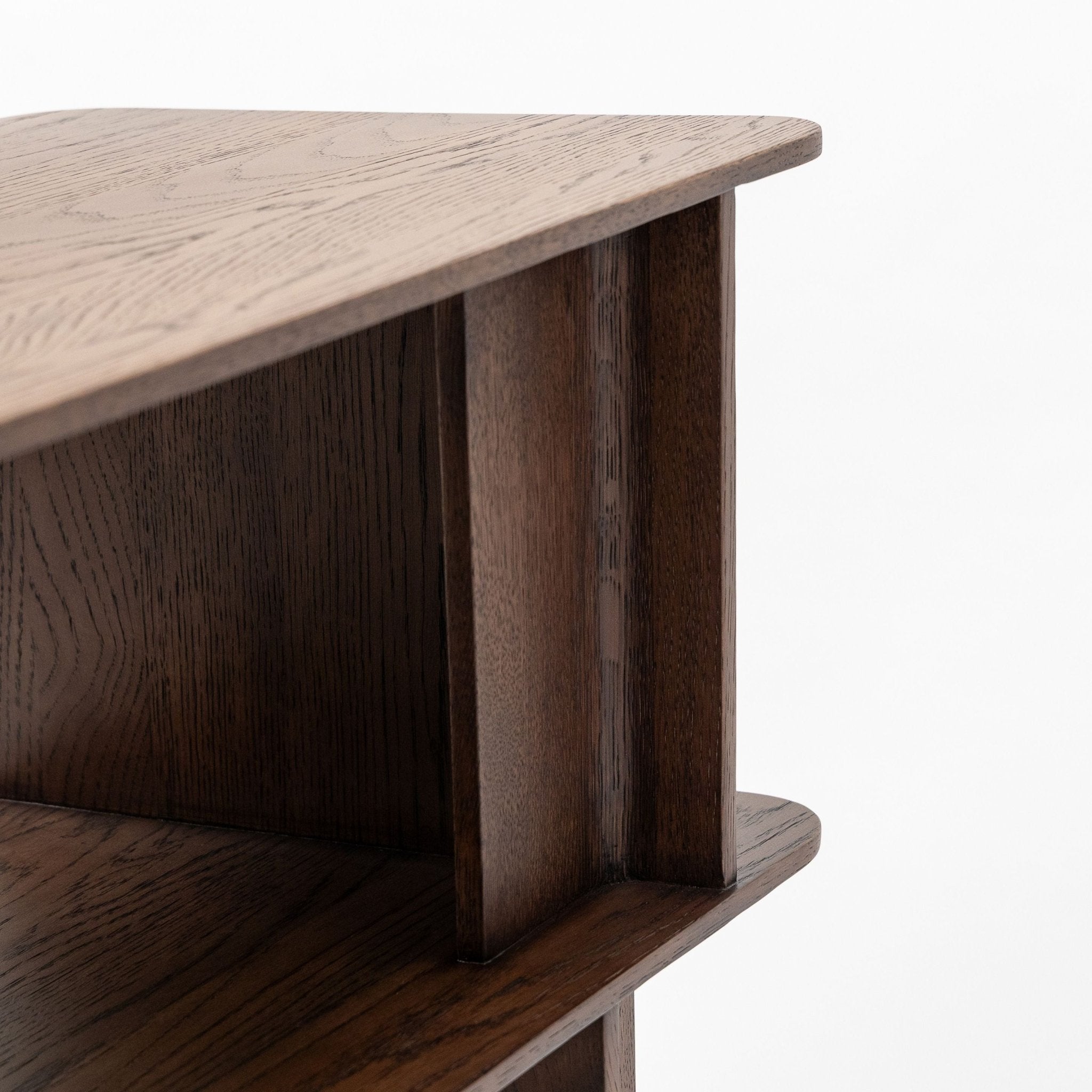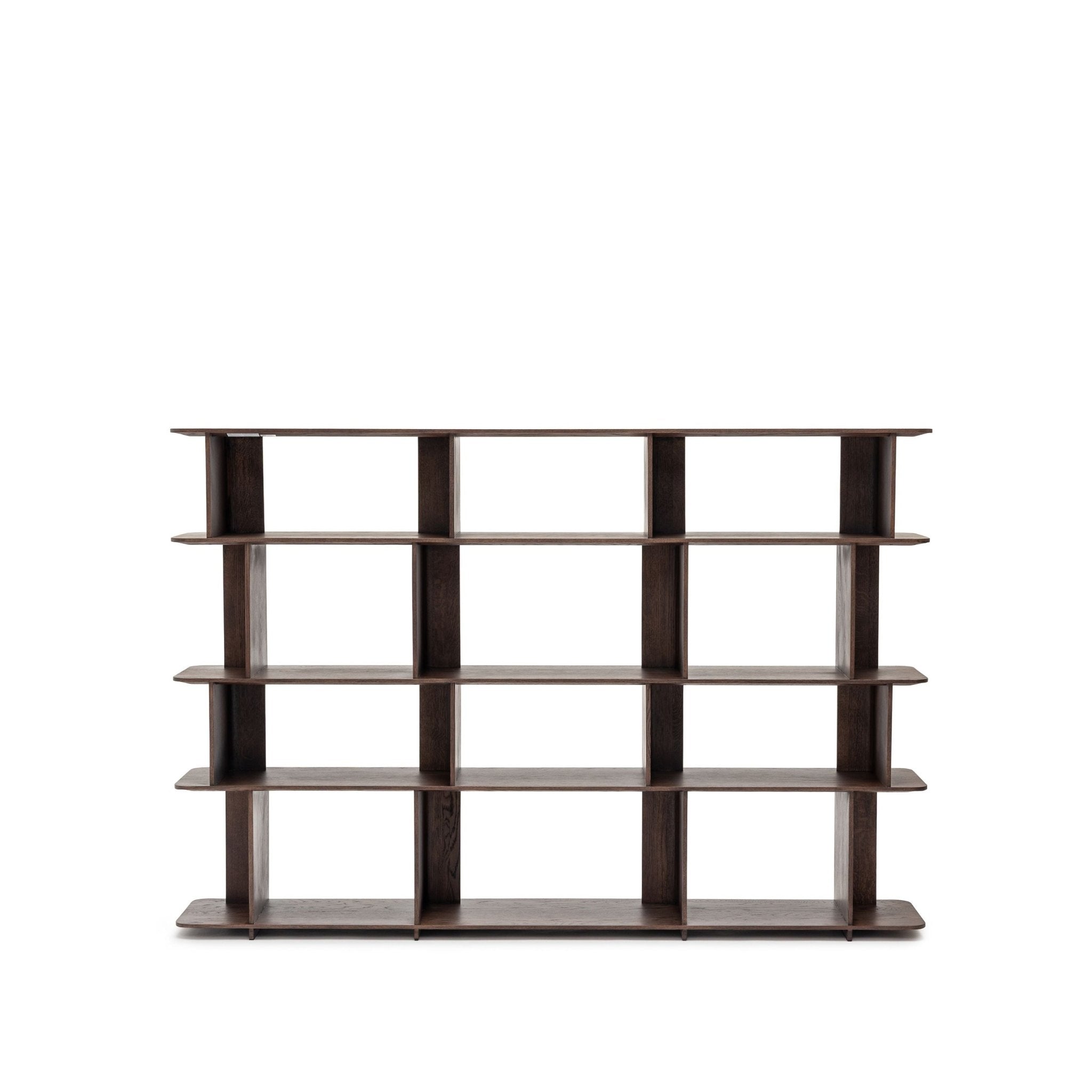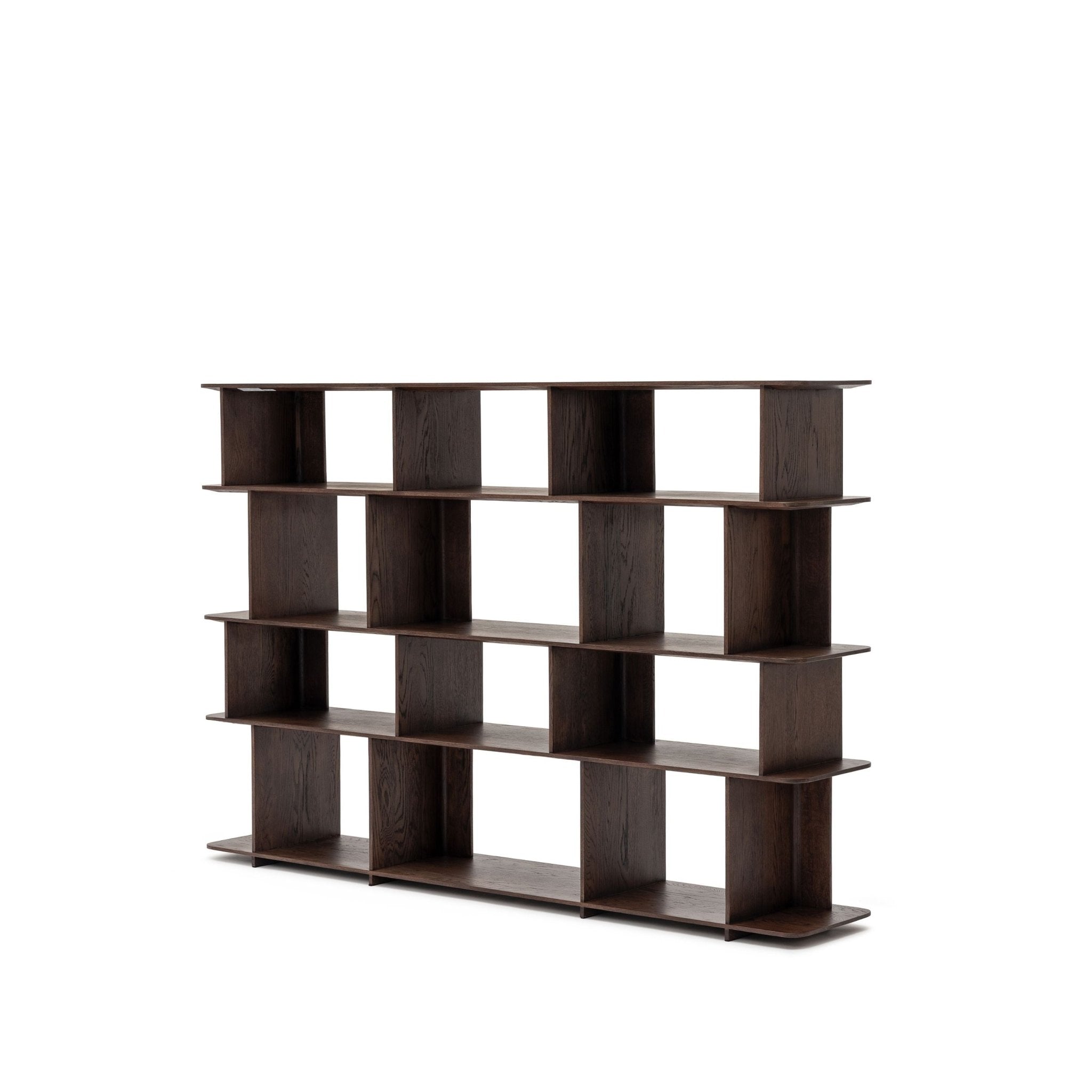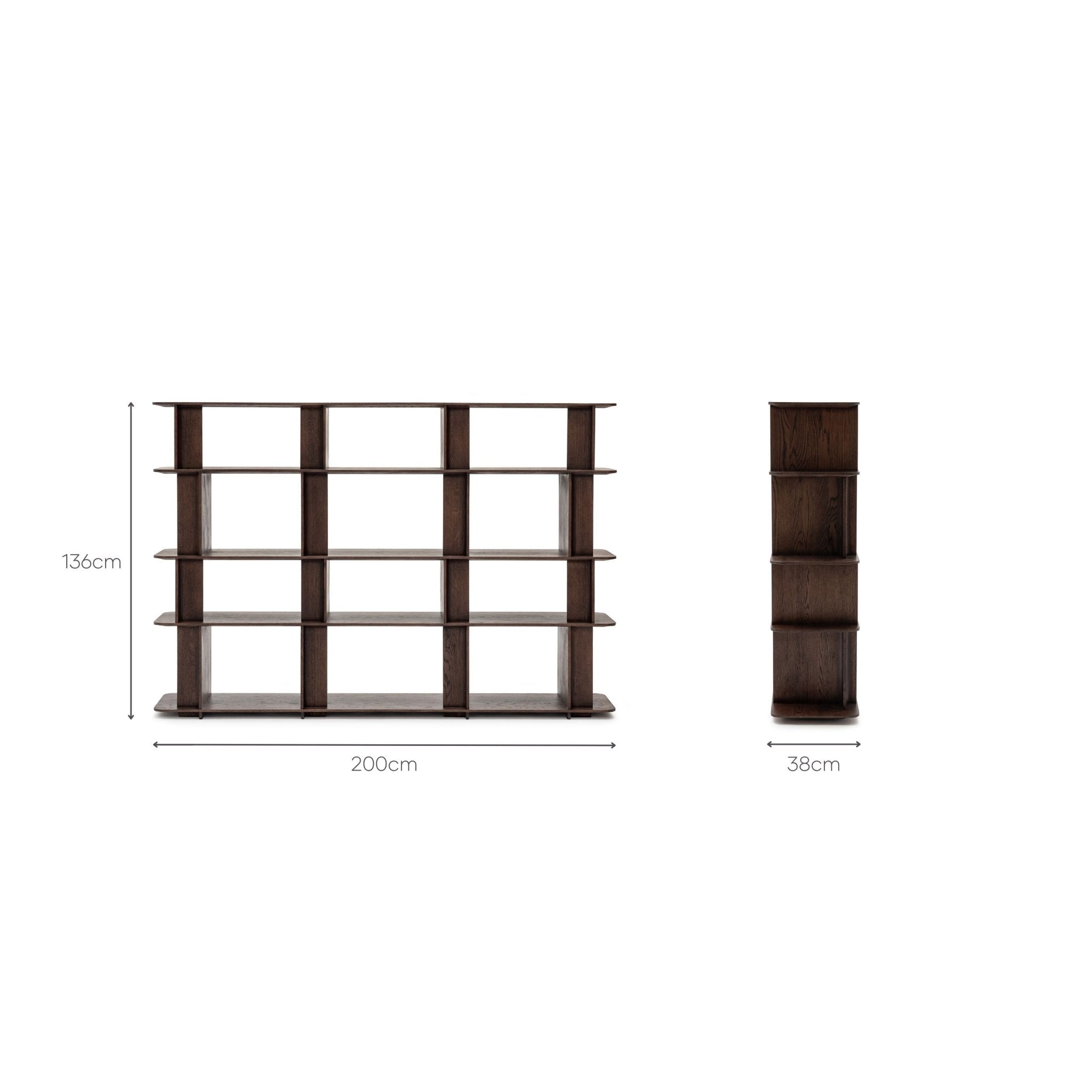 Perpendicular panels intersect to form the uprights, which, arranged in alternating directions, create a feeling of movement and break up the symmetry, while also offering interesting display and storage options.
