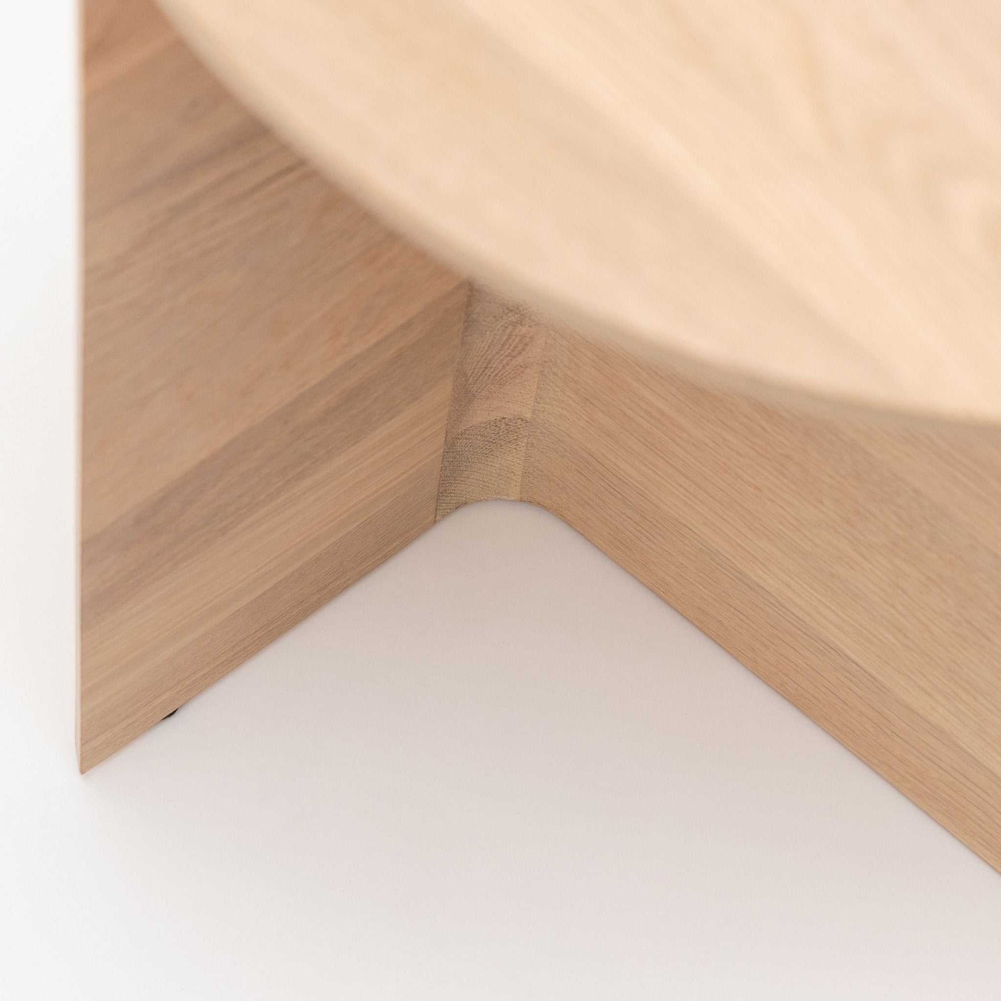Solid timber panels in an understated Round shape form the base of the Jaunt table. Subtle and harmonious changes in the thickness of the panels, chunky at the centre and tapering out to a narrow gauge at the edge, provide an almost imperceptible dynamism, echoed by the tapered edge of the tabletop, which can be made of solid wood, natural stone, or glass.