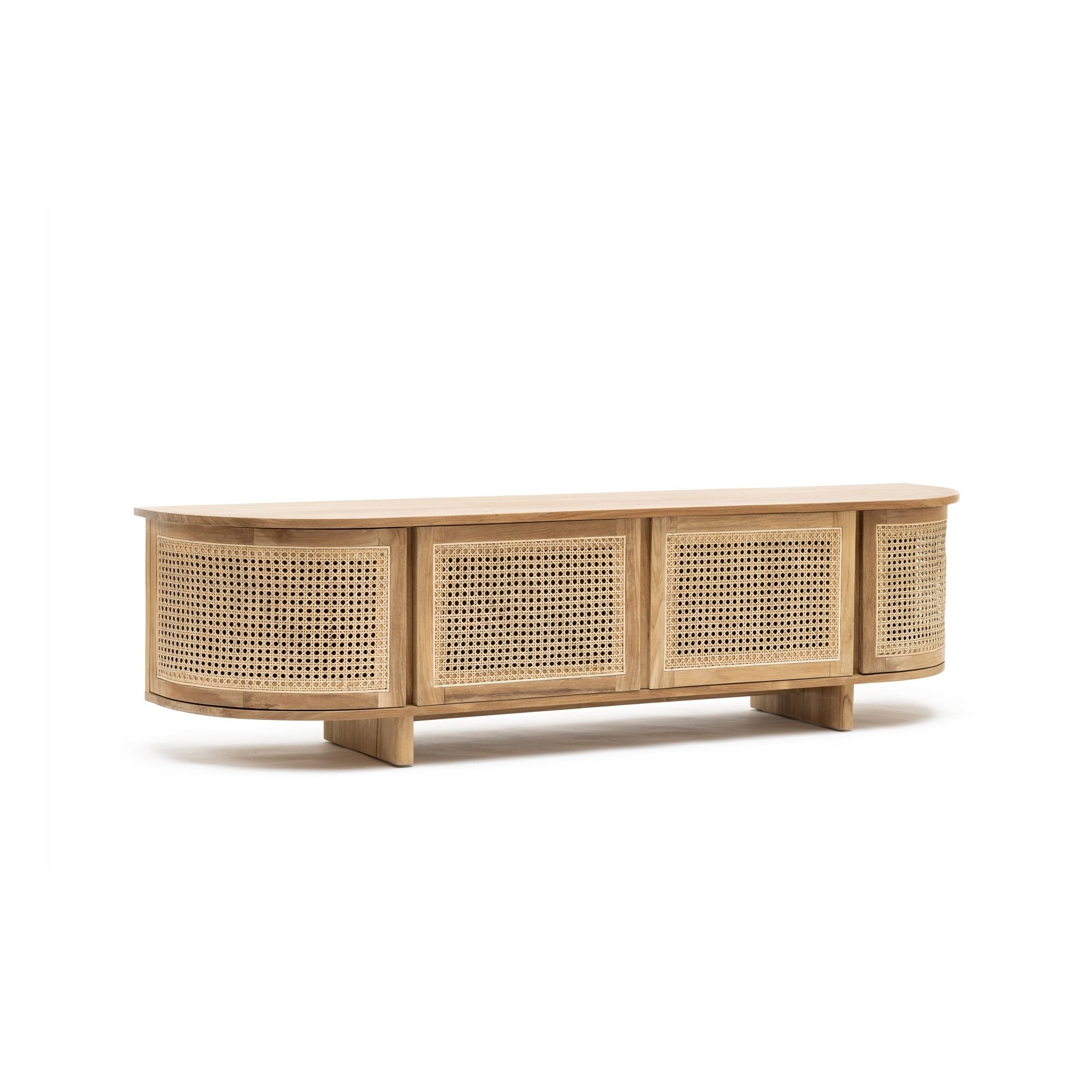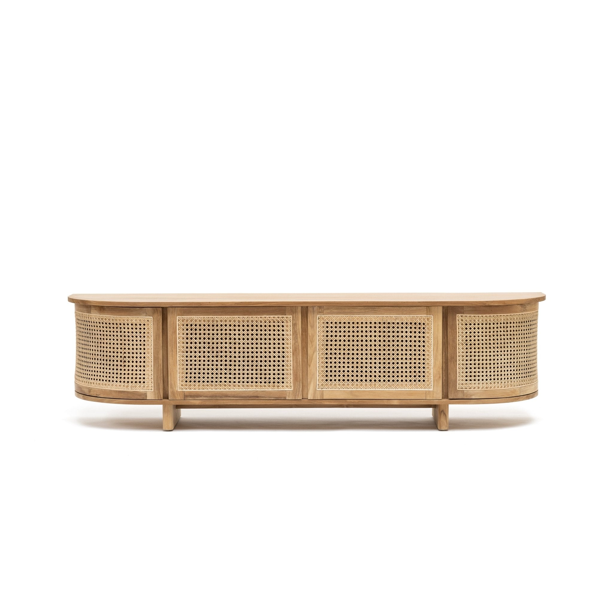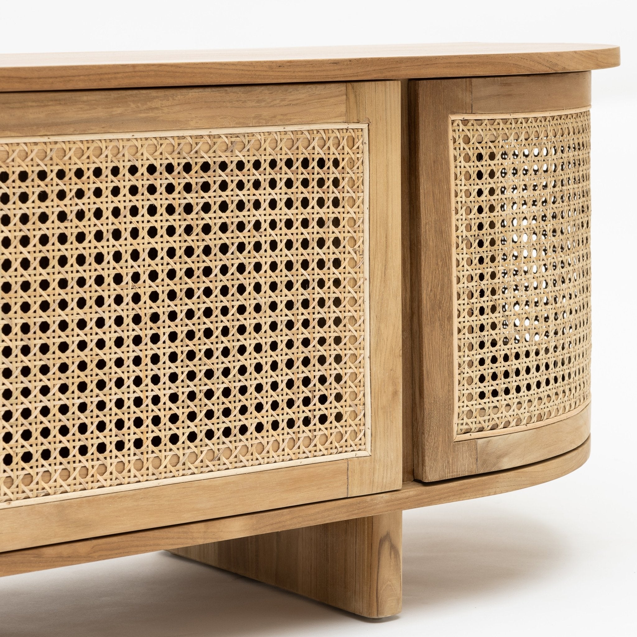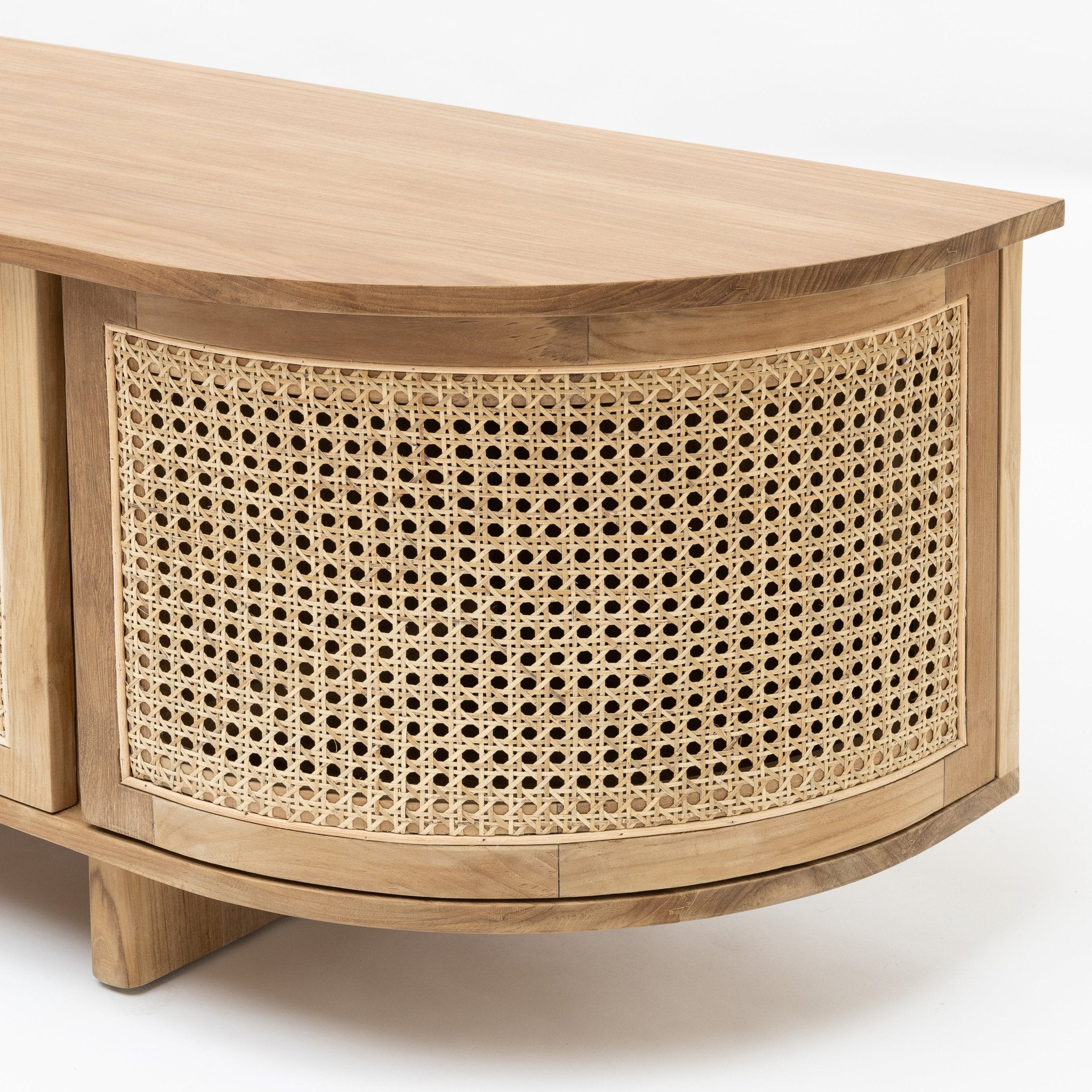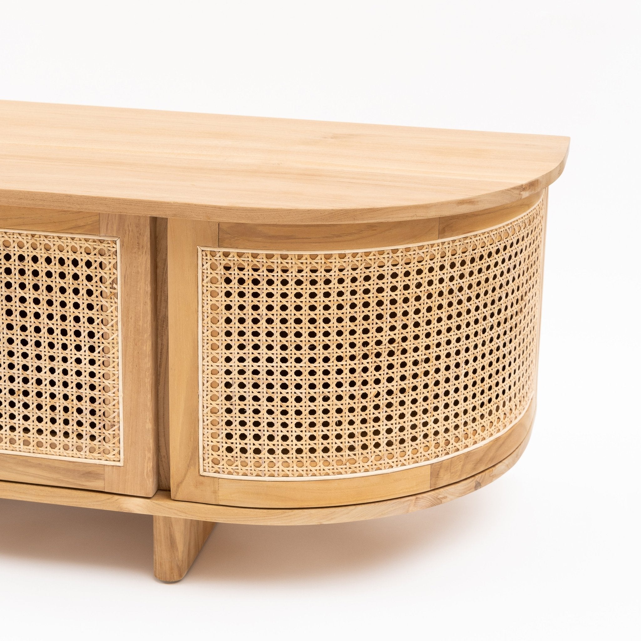 The Cali curved entertainment TV unit is crafted in solid teak wood and natural rattan webbing. The rounded sides add softness and allow for ample storage using 4 fully opening doors.