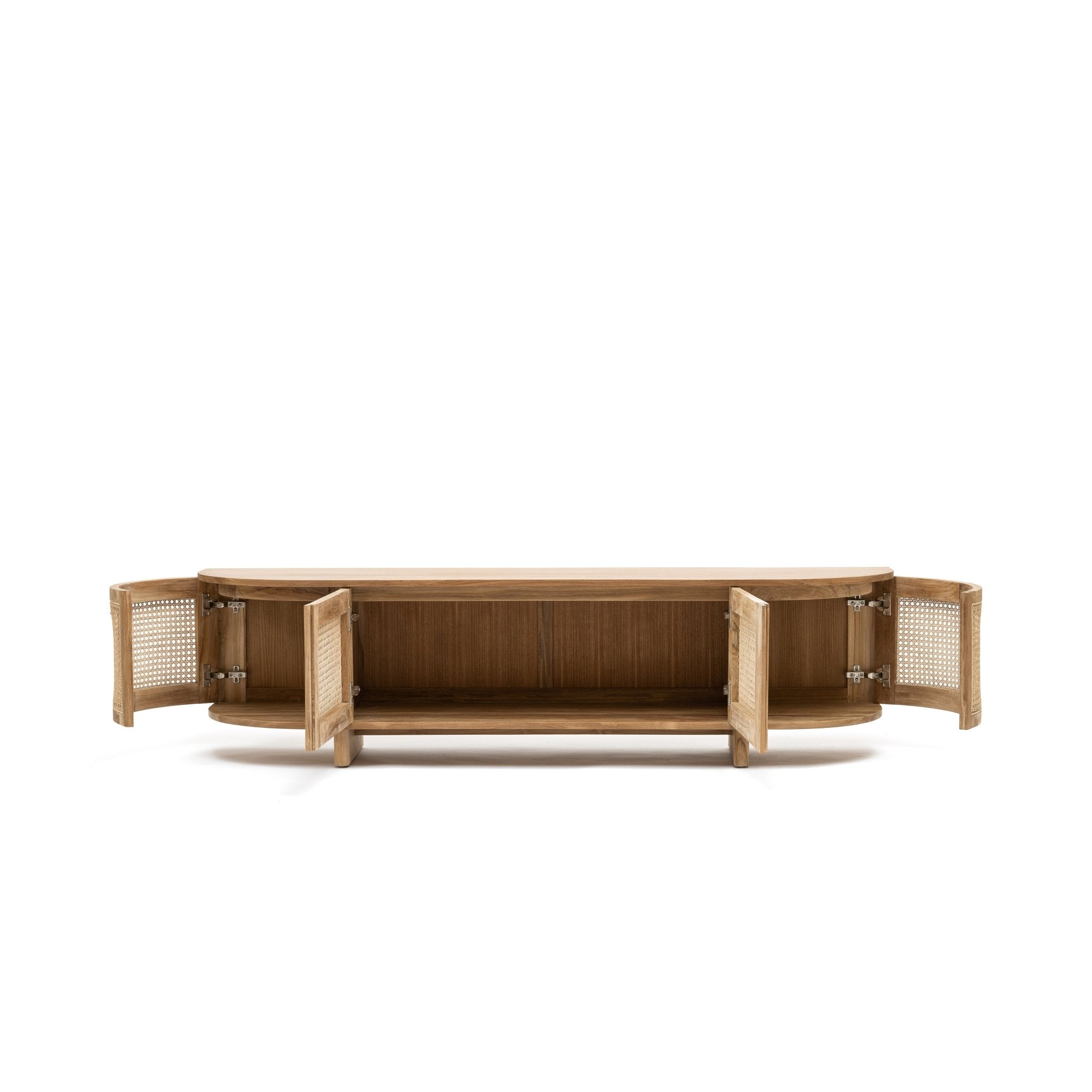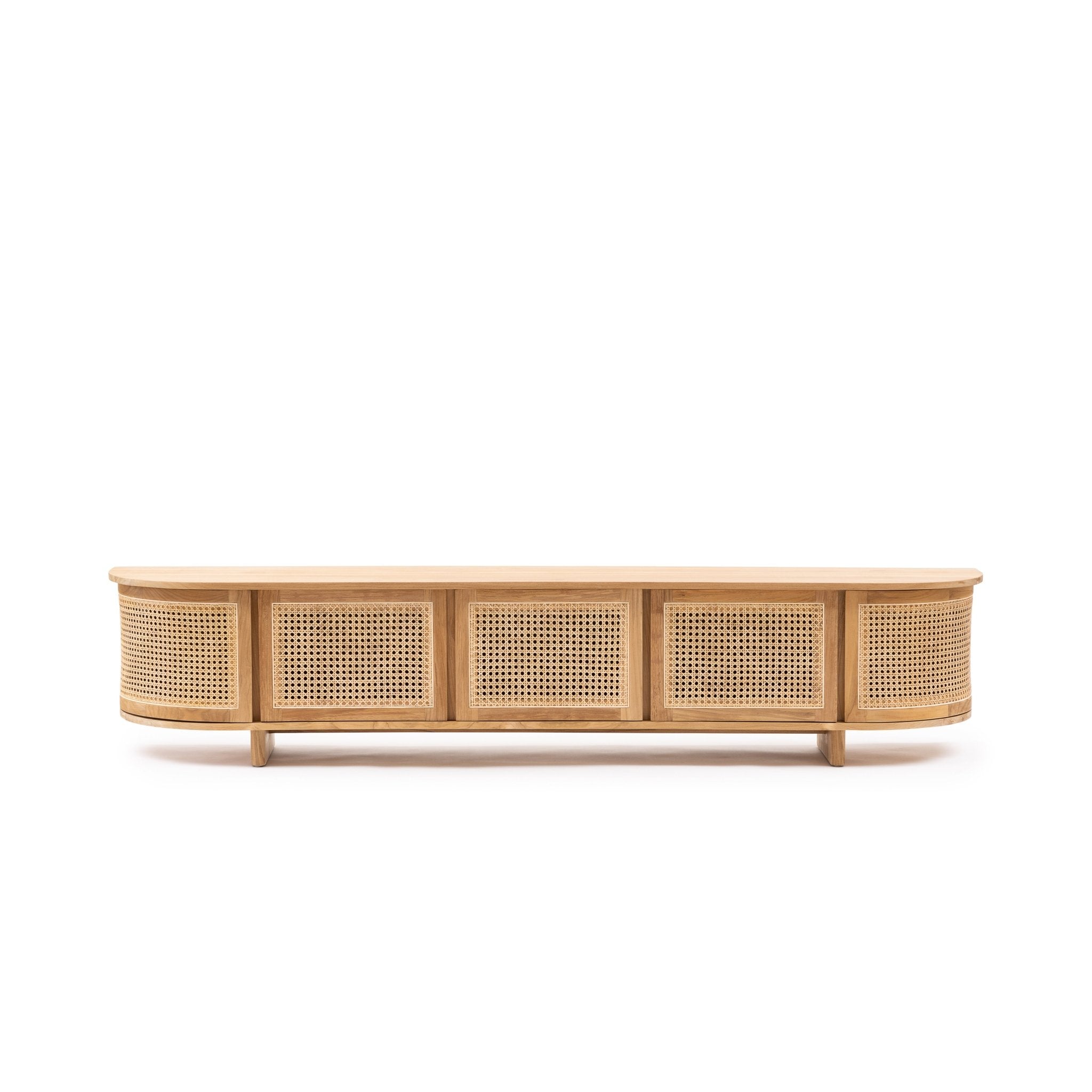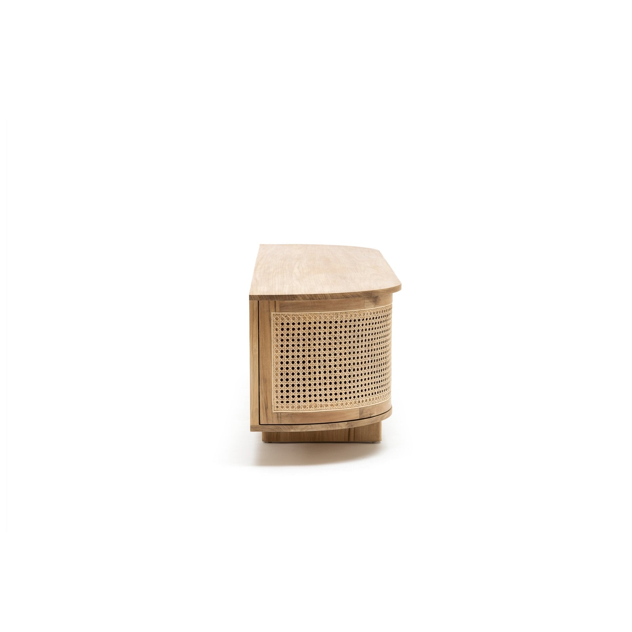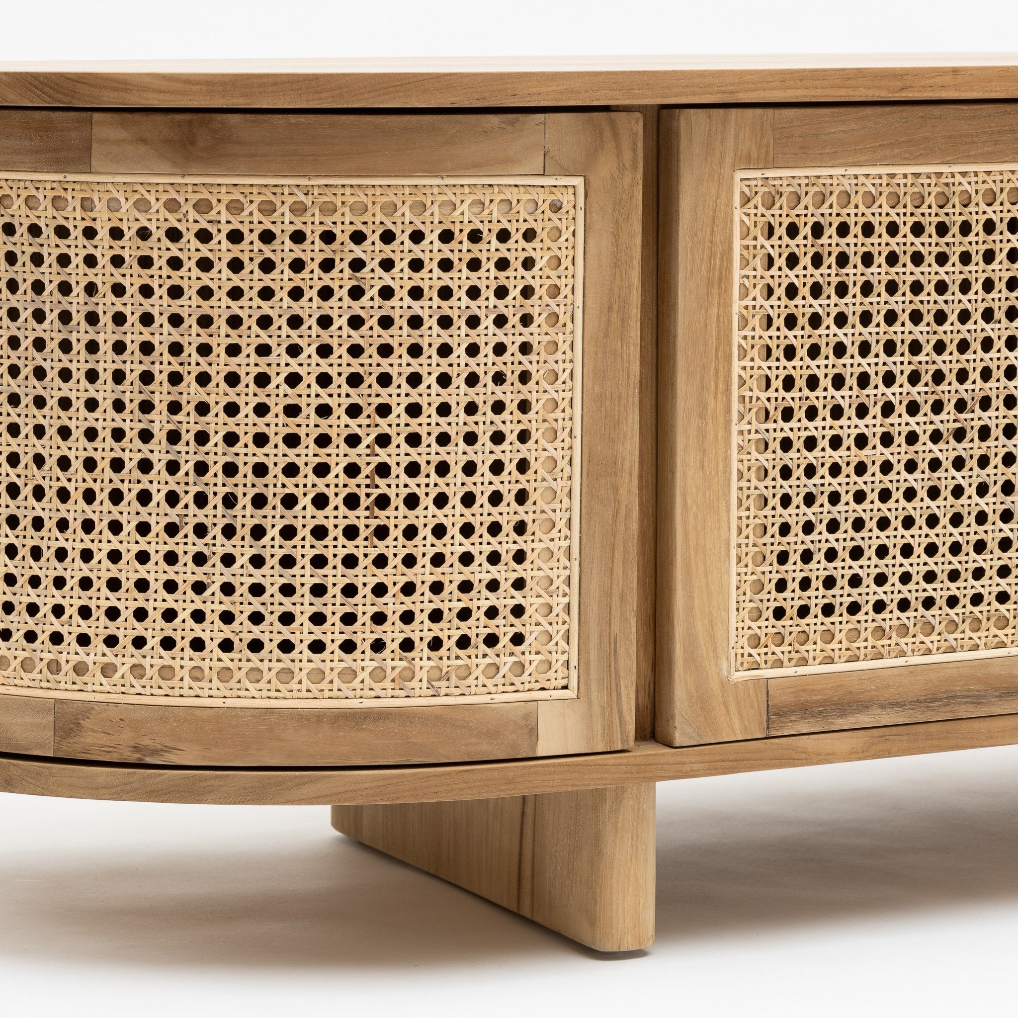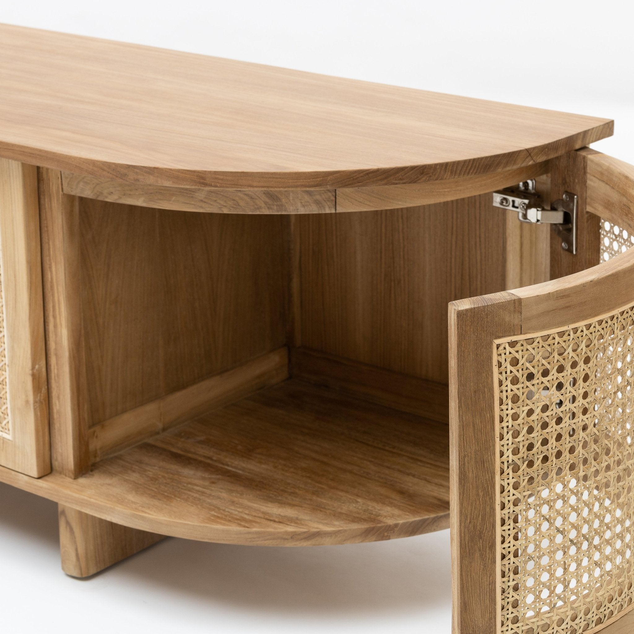 The Cali curved entertainment TV unit is crafted in solid teak wood and natural rattan webbing. The rounded sides add softness and allow for ample storage using 4 fully opening doors.