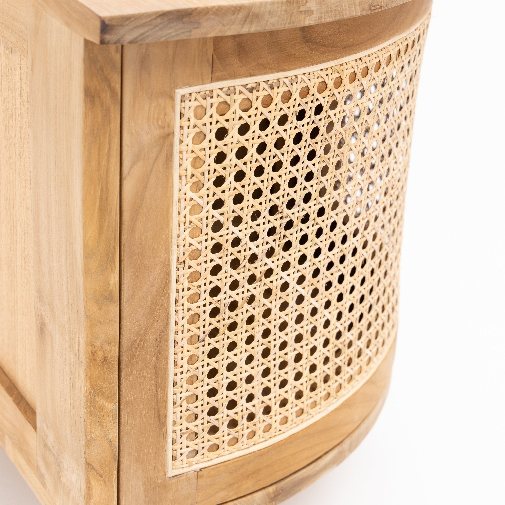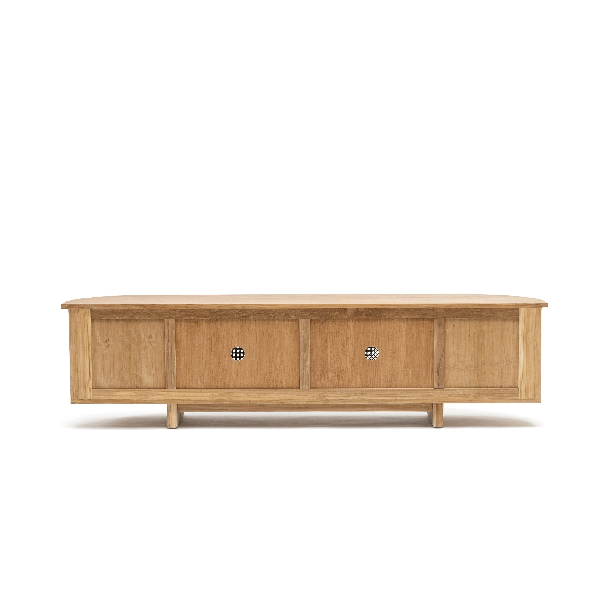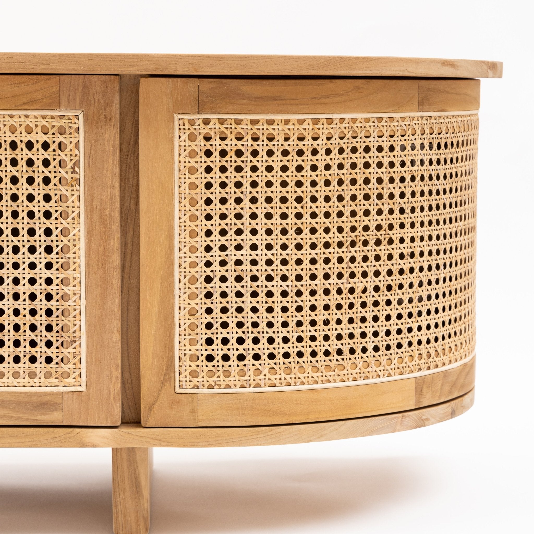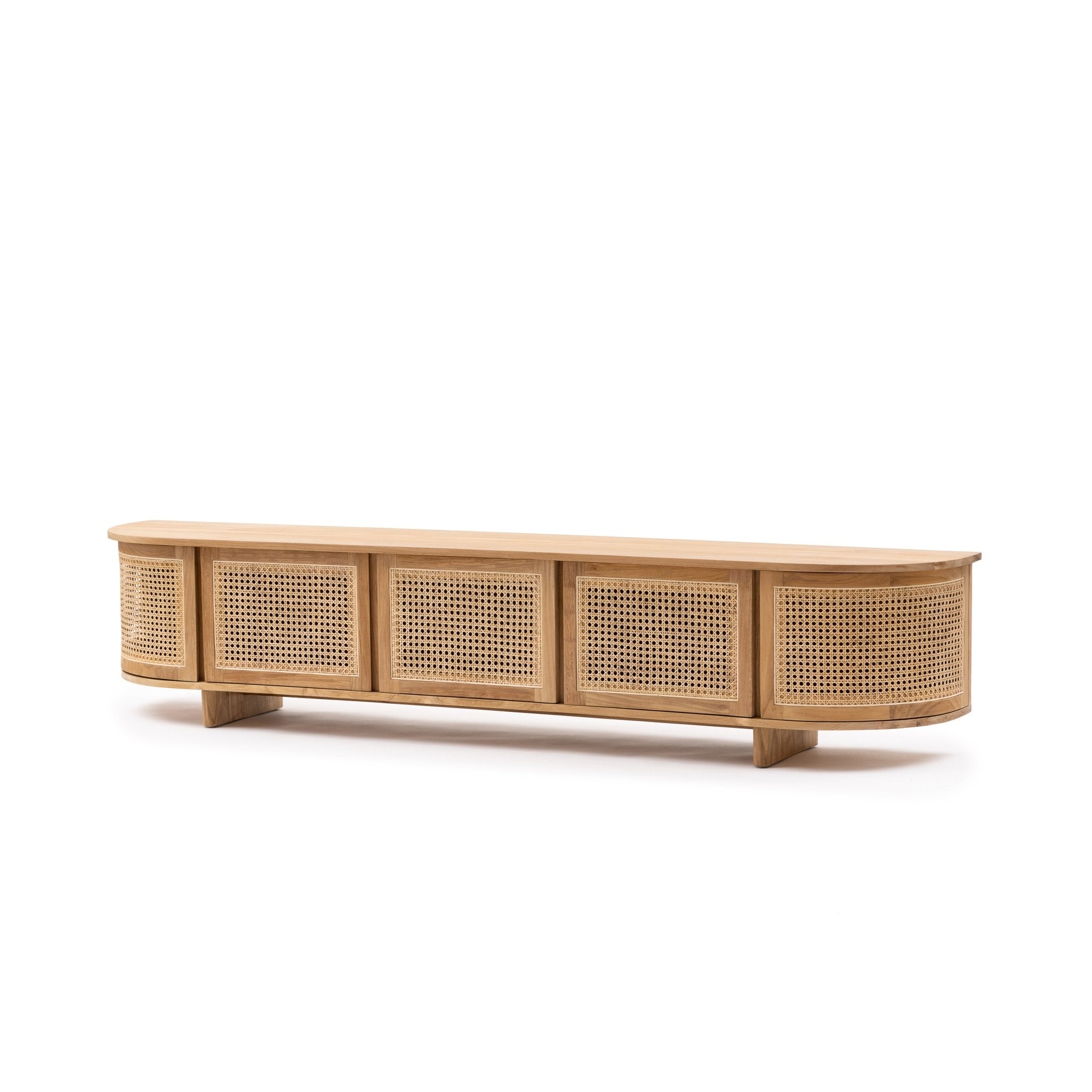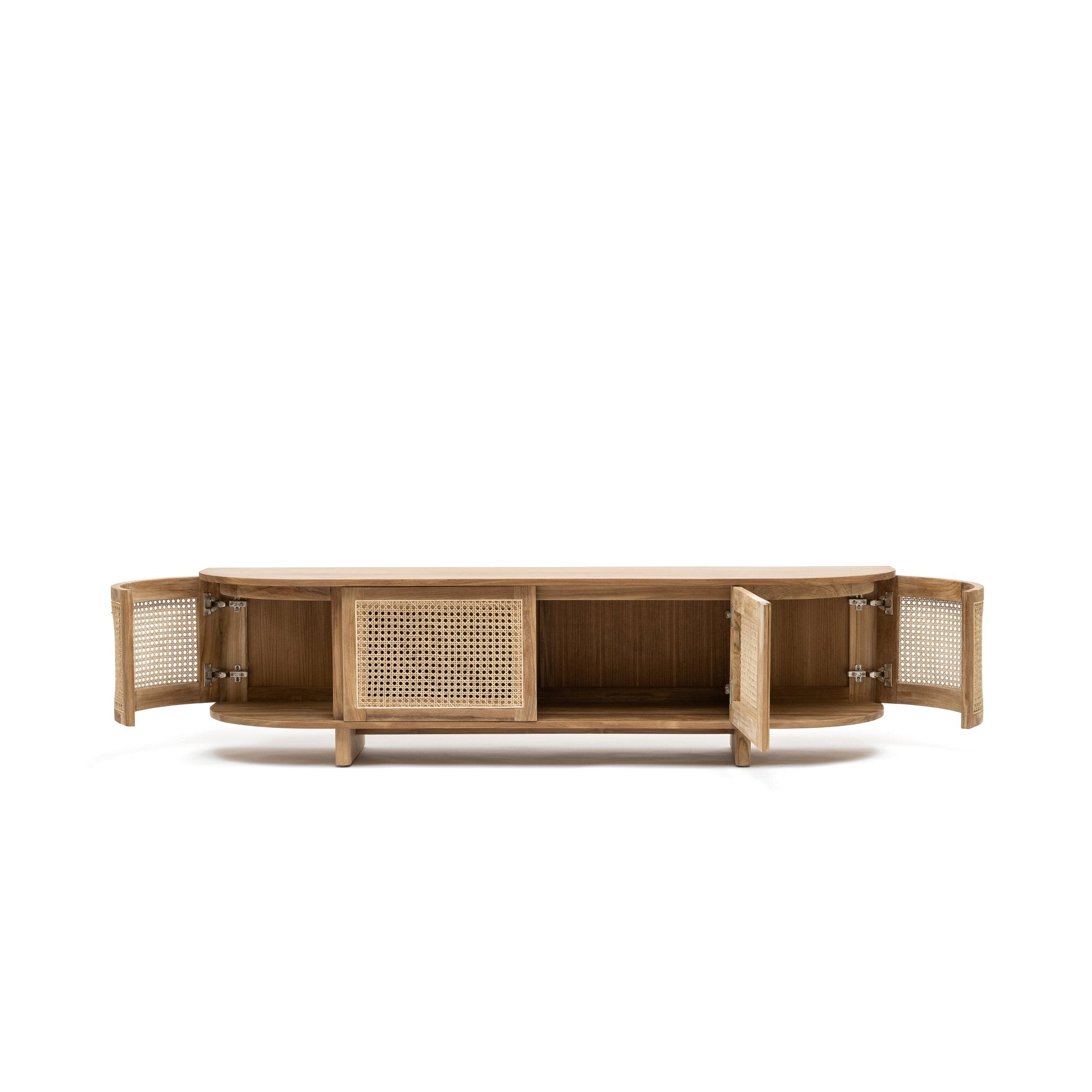 The Cali curved entertainment TV unit is crafted in solid teak wood and natural rattan webbing. The rounded sides add softness and allow for ample storage using 4 fully opening doors.