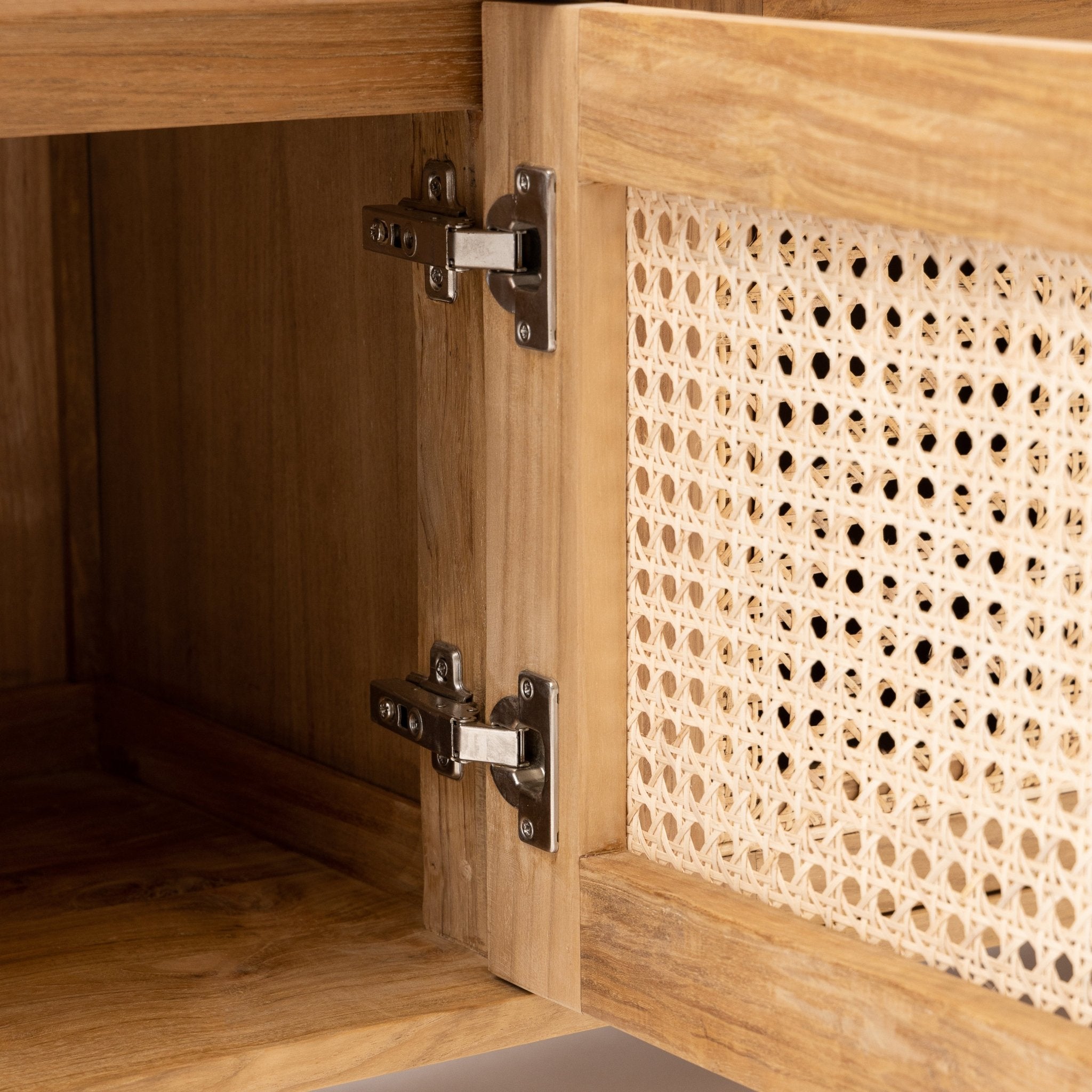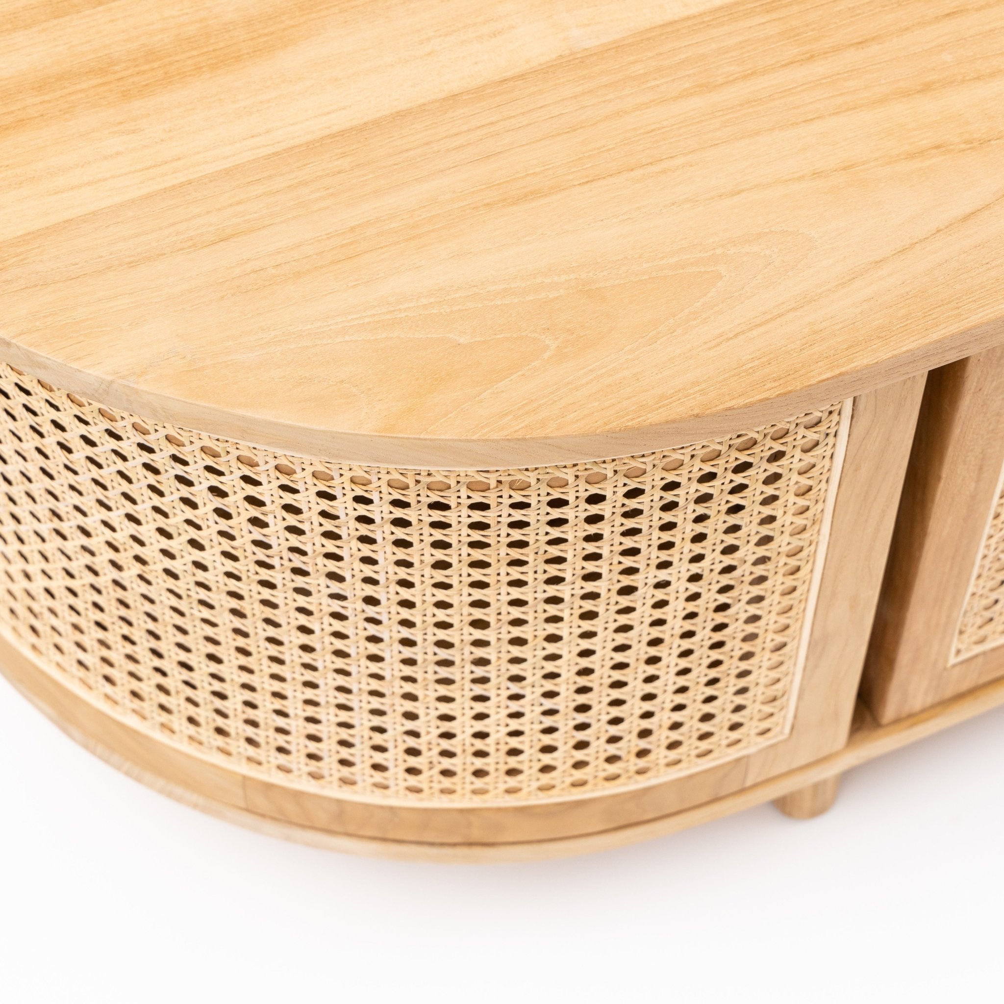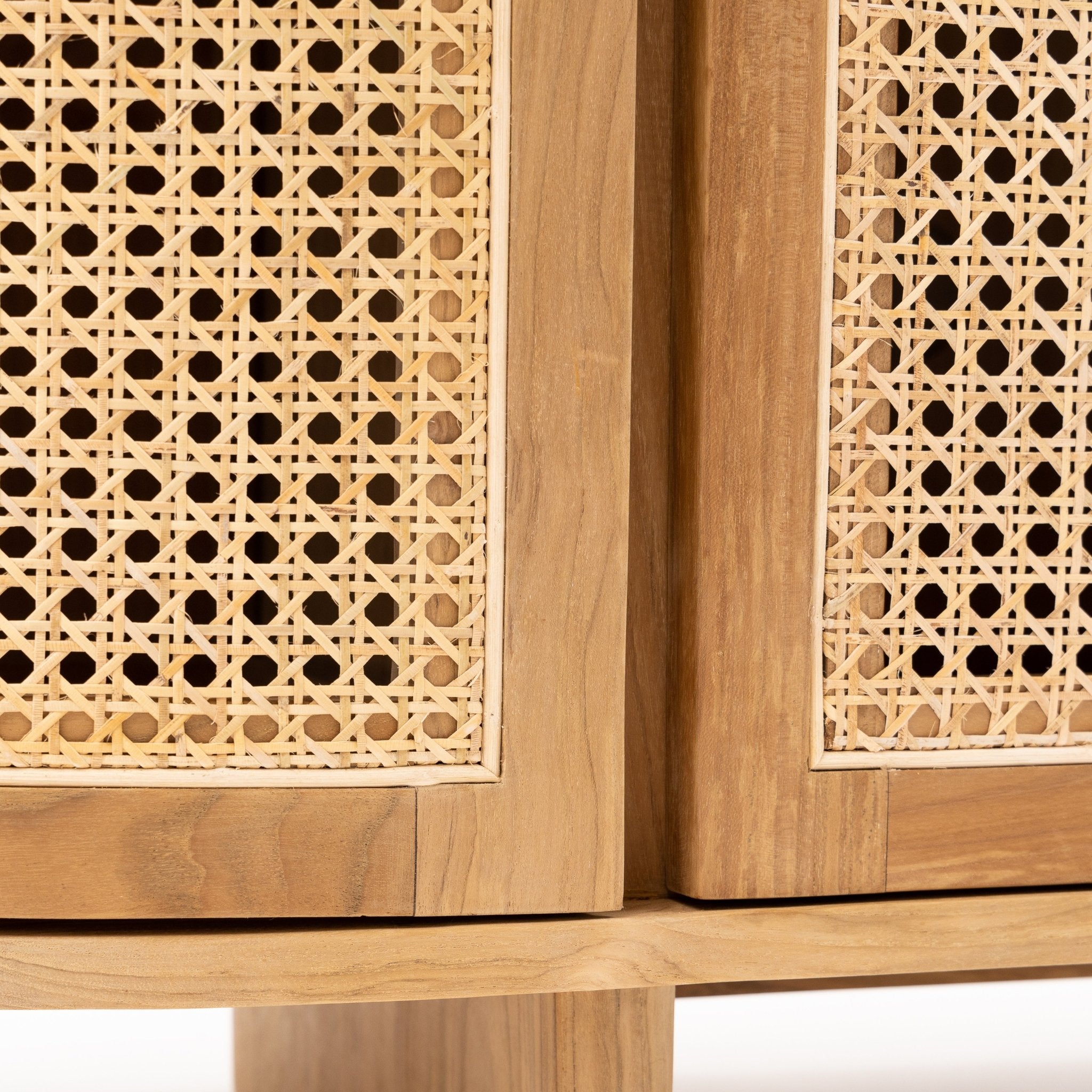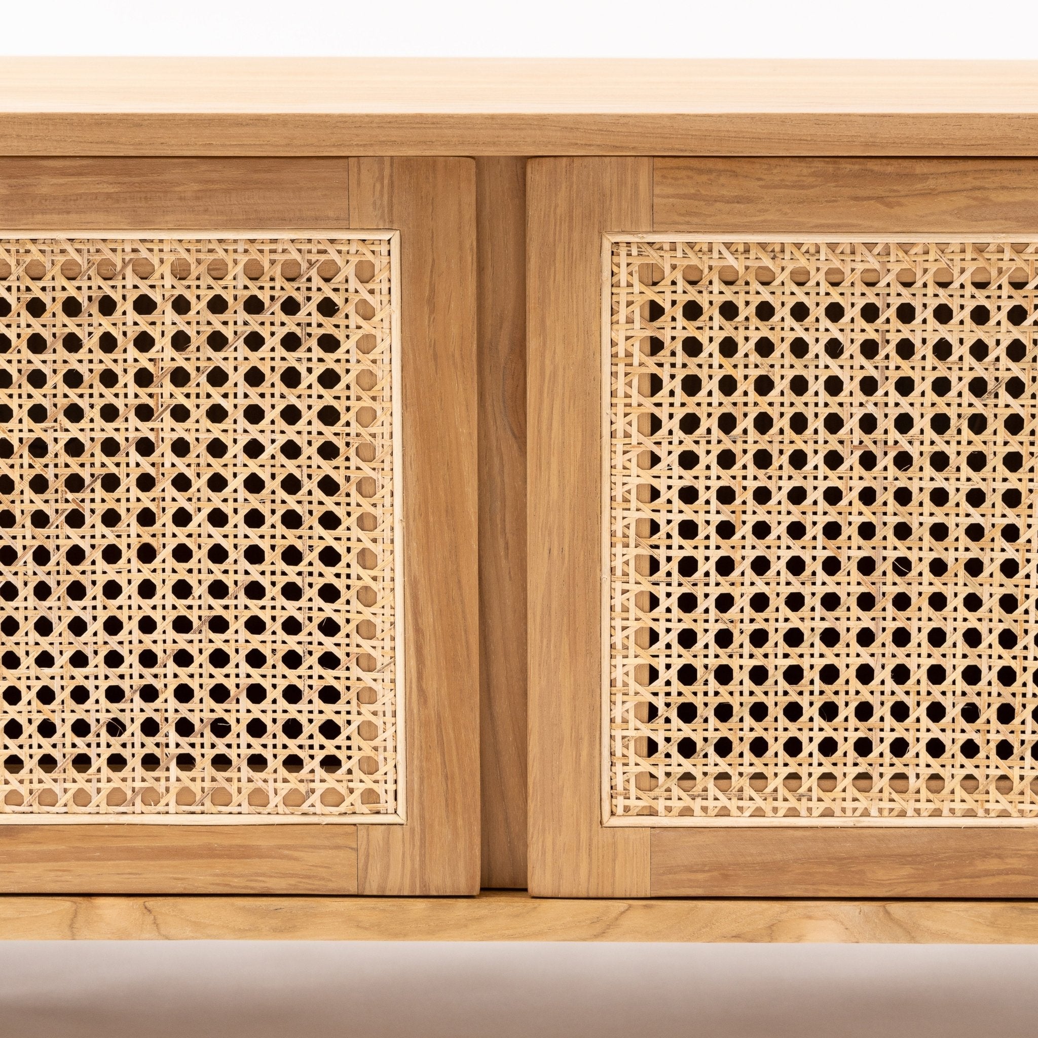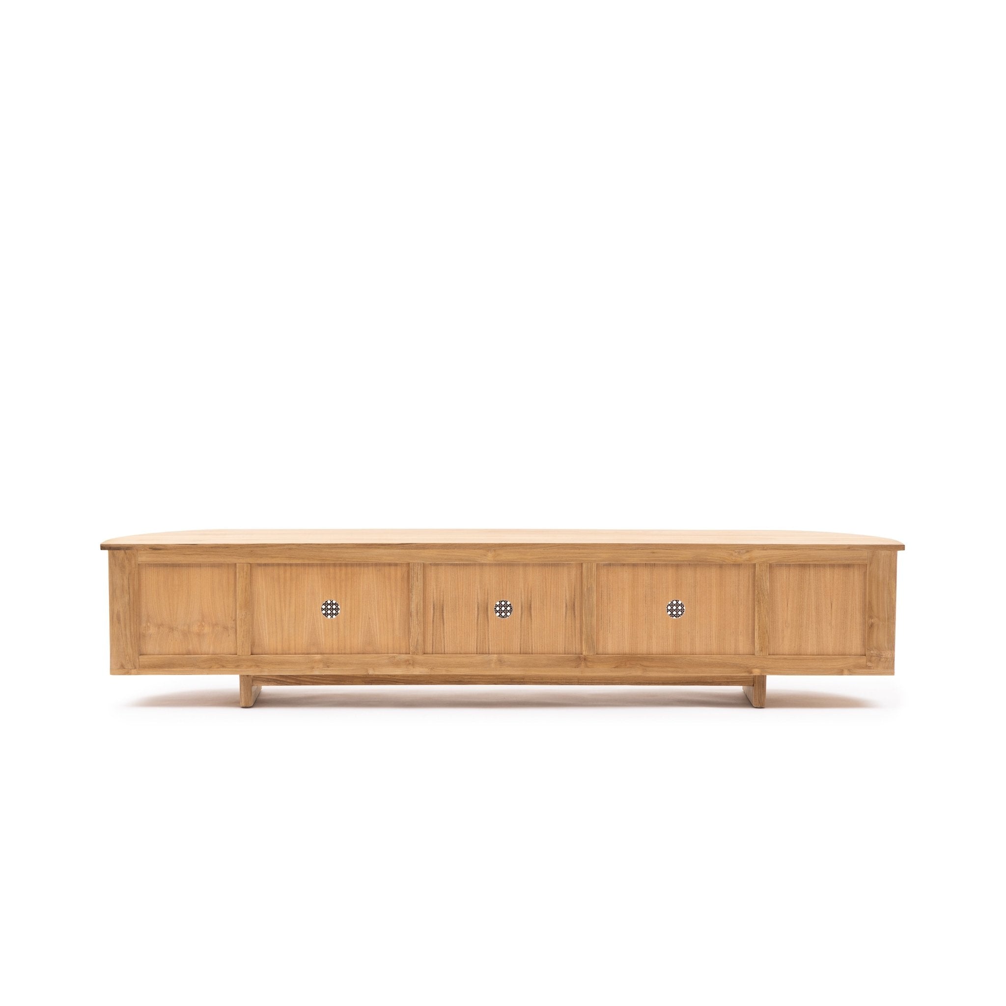 The Cali curved entertainment TV unit is crafted in solid teak wood and natural rattan webbing. The rounded sides add softness and allow for ample storage using 4 fully opening doors.