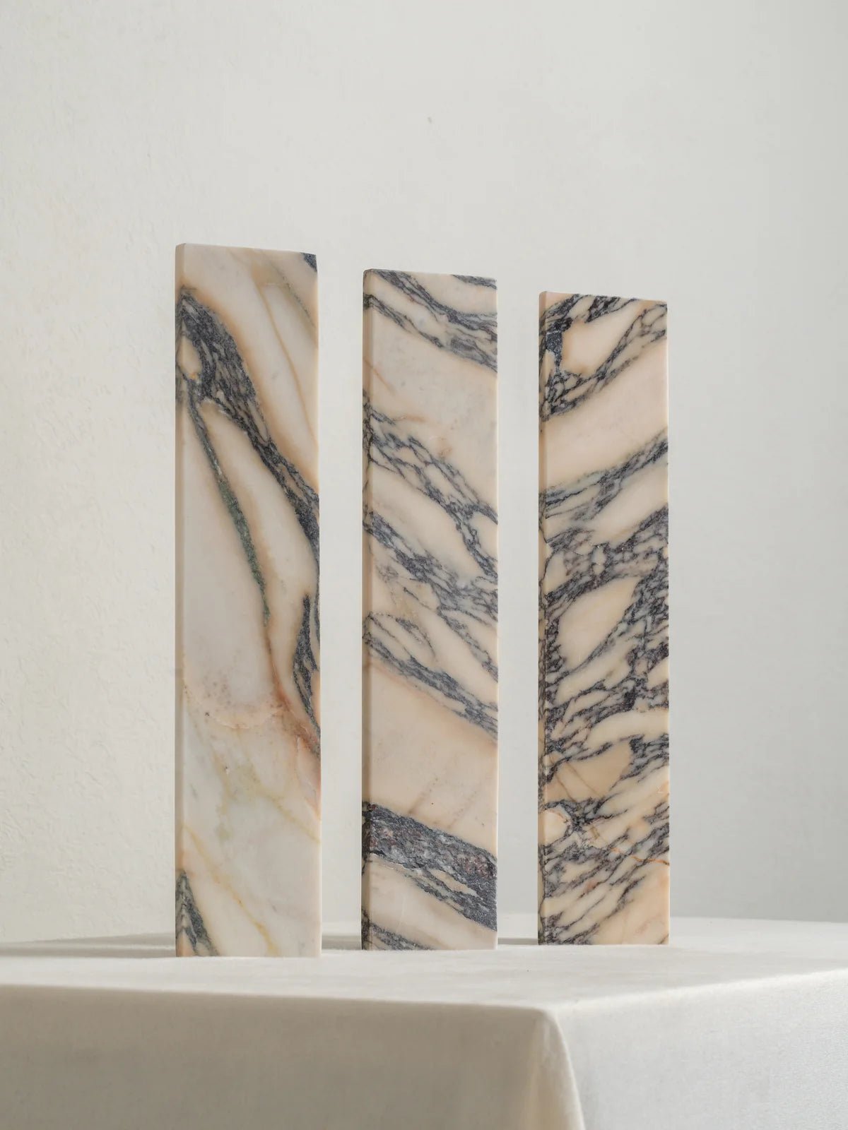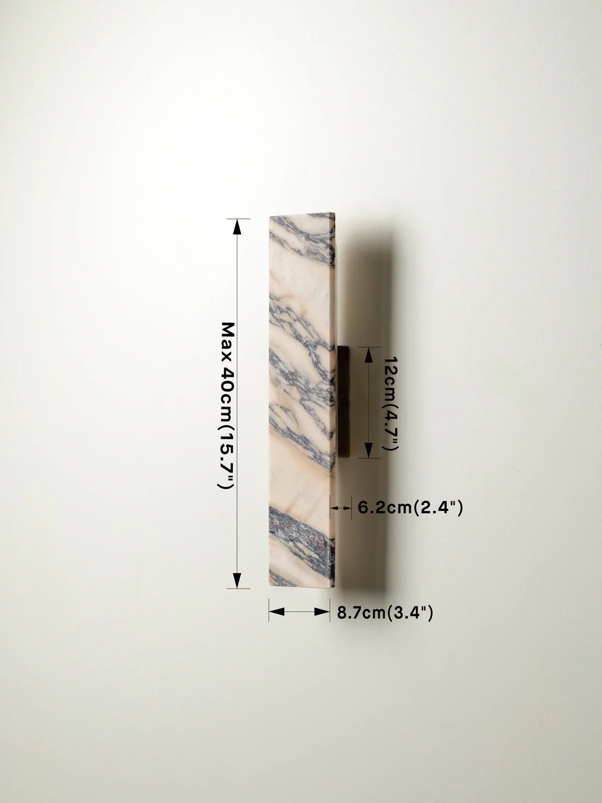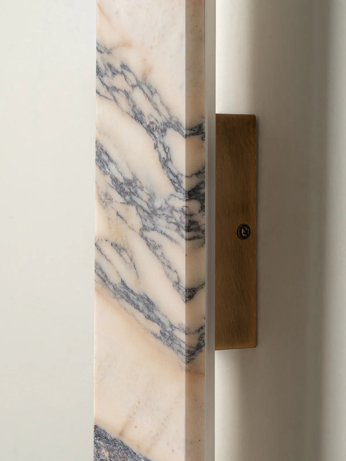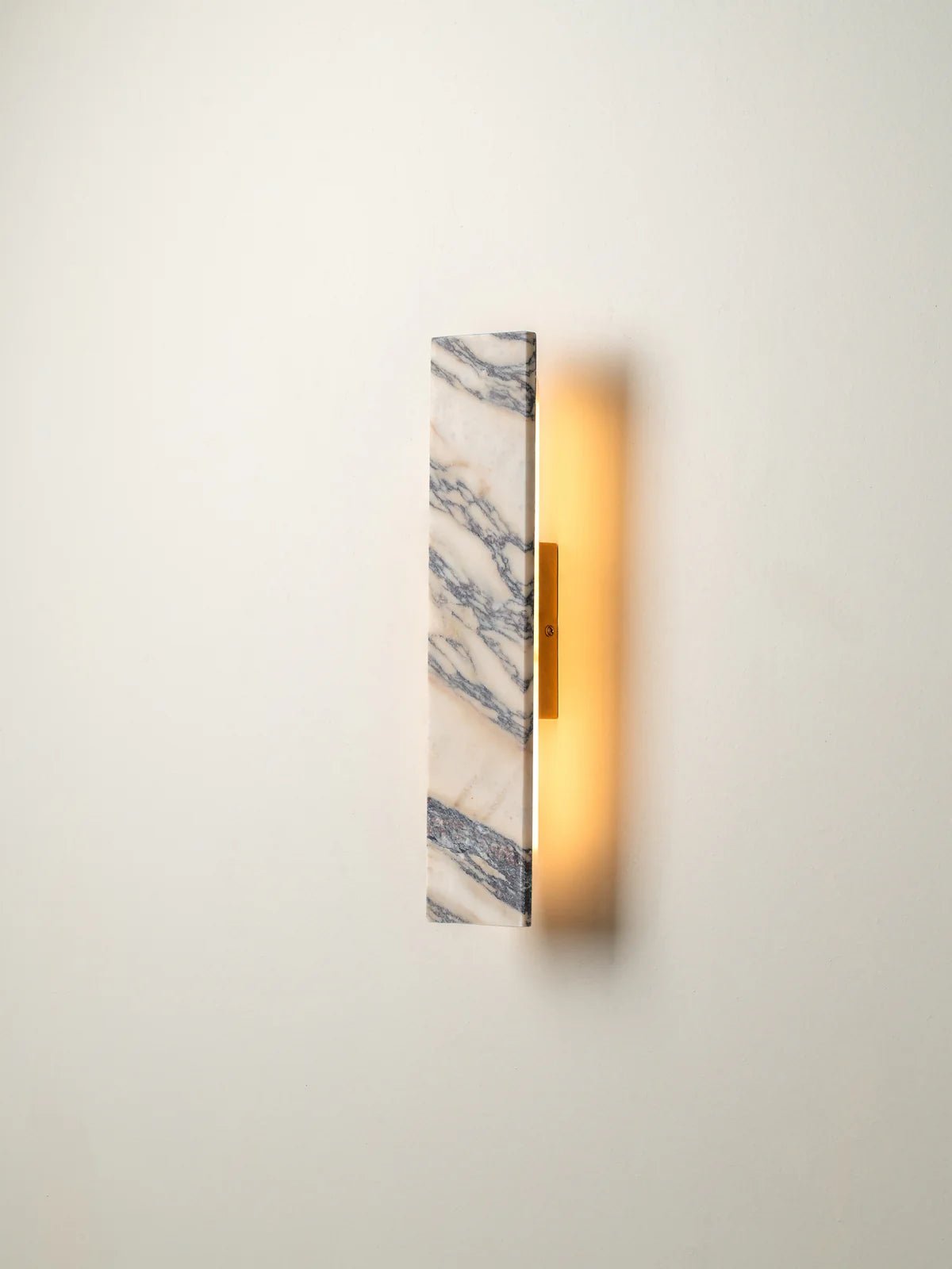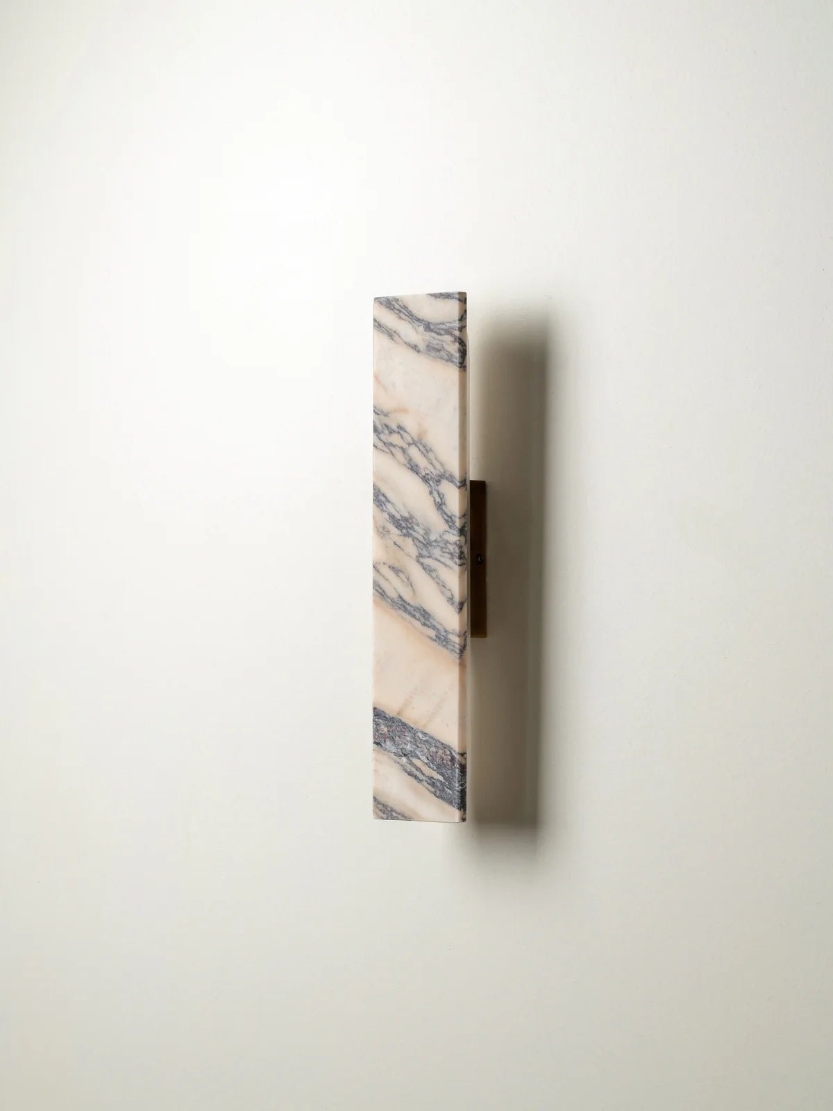 Elevate your room with the understated luxury of our Canti wall light. Handcrafted from Calacatta Viola marble, each piece showcases natural veining in rich burgundy and soft grey tones, making every light a one-of-a-kind statement. The geometric silhouette offers a clean, modern profile, while the warm, diffused glow enhances the natural beauty of the marble. Ideal for hallways, bathrooms, or as a sophisticated bedside sconce.