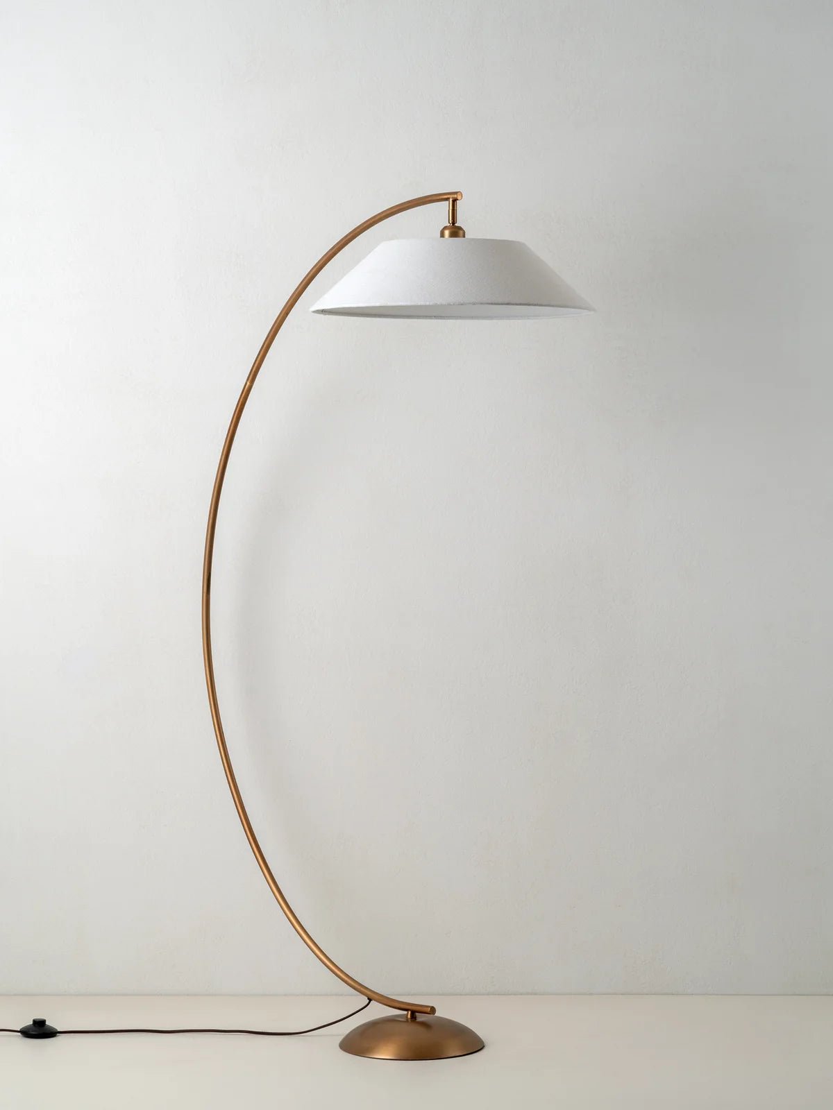 Classic, refined, graceful. A classic over-arch floor lamp with an update. Paired with a shallow off-white linen cotton shade, this floor lamp will happily sit in both a modern and more traditional interior.