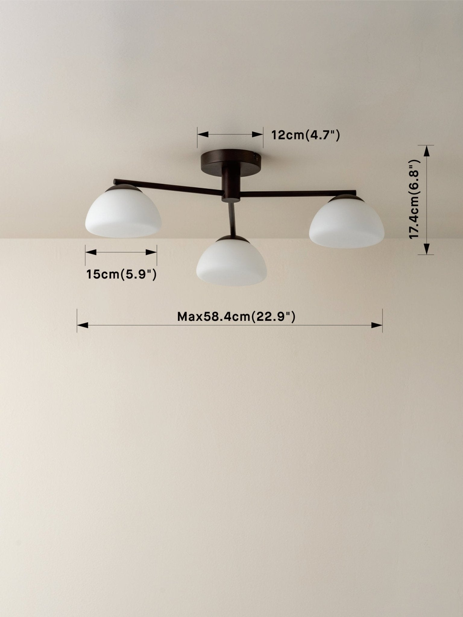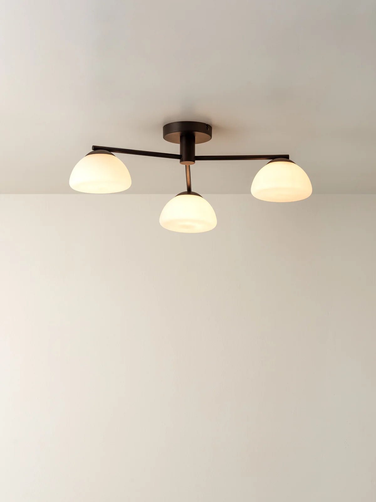 Modest, mighty, modern. Making the most of our enclosed opal glass dome shade, this compact bronze flush light is full of practical style. 3 asymmetrical arms help spread the light with a statement, even in a smaller space. This light is IP44 rated for use in bathroom zones 2 and 3.