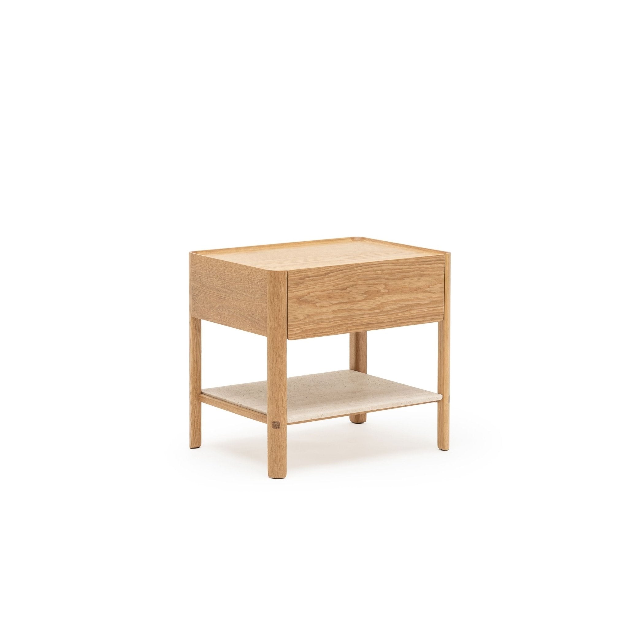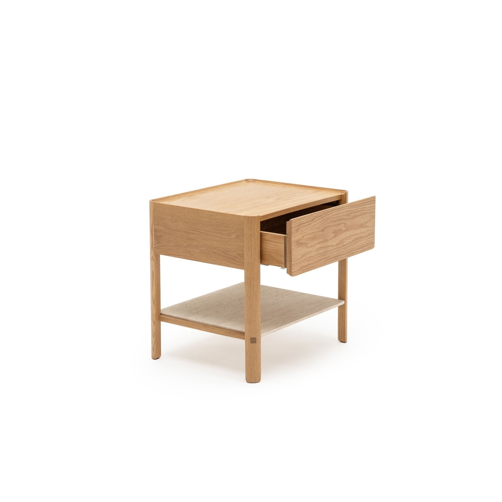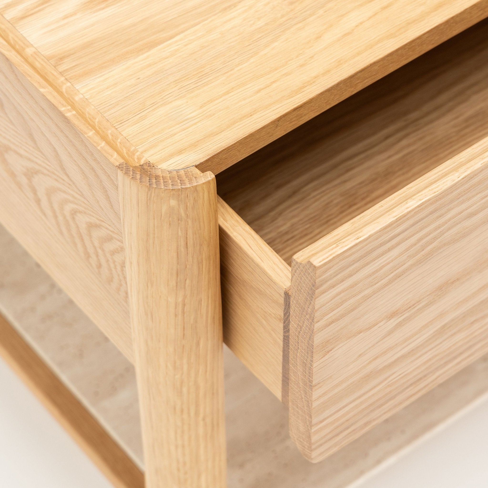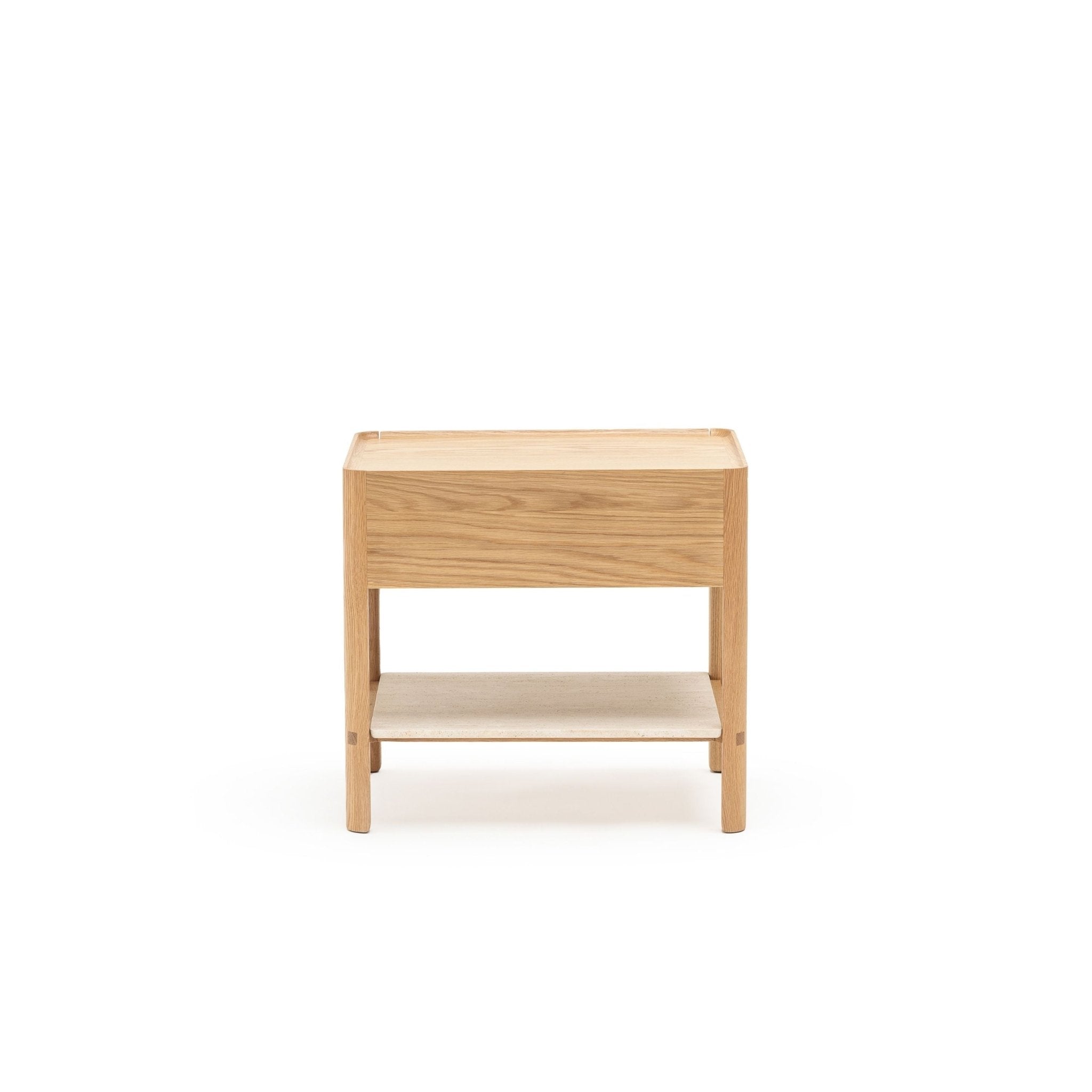 Tye was born from a place of function and minimalism. The bedroom is a place for rest, without need for distractions and ornaments. The rounded legs keeps your shins safe, and the scooped-out top provides a safe shelf for your bedroom essentials while offering a comfortable pull for the draw that stores your personal items. By choosing the travertine shelf, you add an element of surprise and contrast to your sacred space.