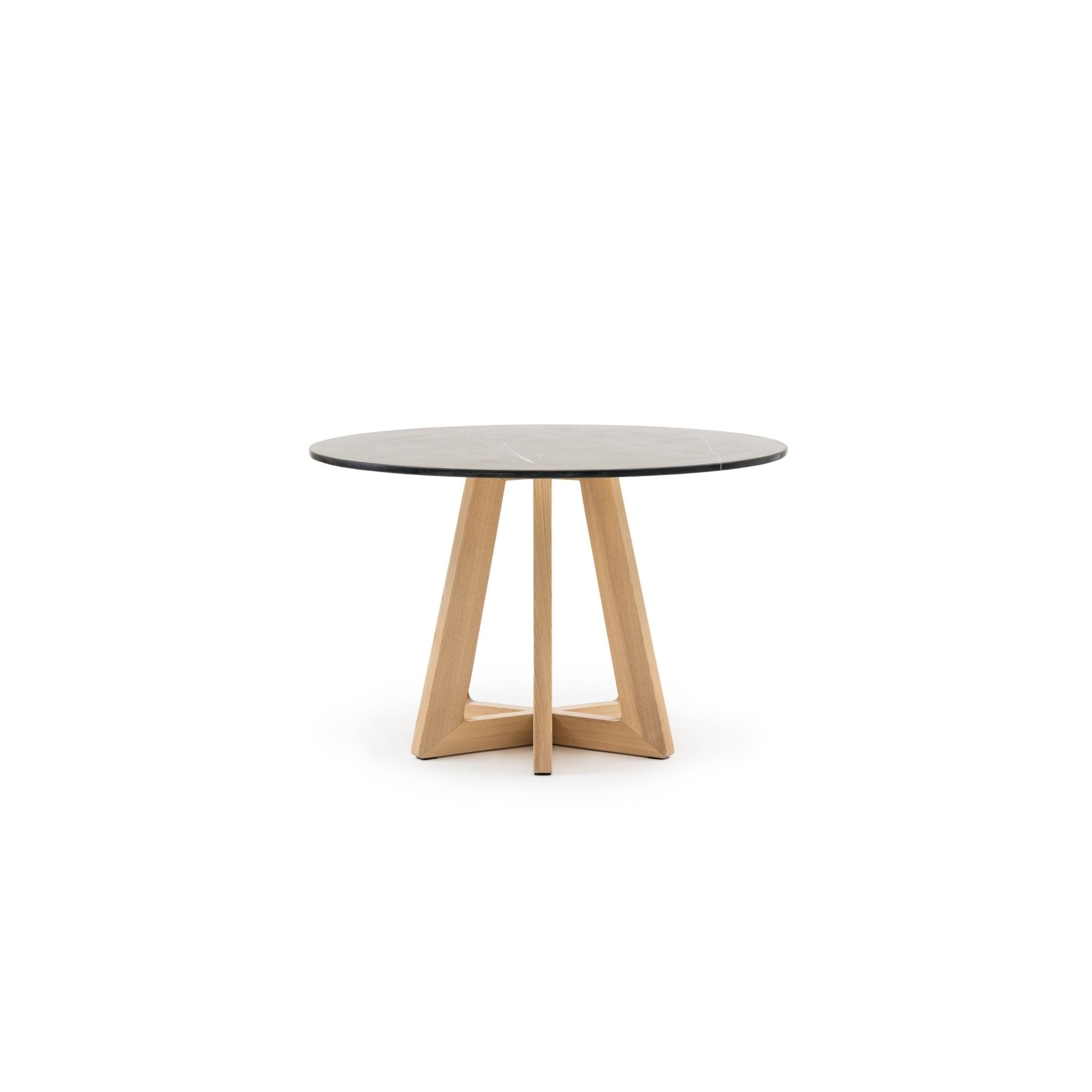 The Chantilly dining table boasts a captivating combination of light ash wood and a nero marquina top. The sleek, black ash wood base forms a solid foundation for a striking duo that exudes a modern aesthetic and impeccable craftsmanship.