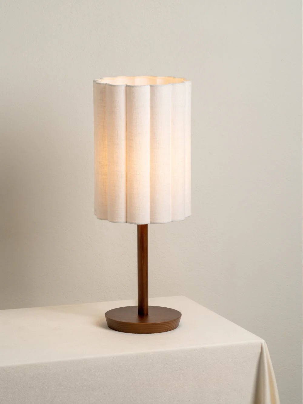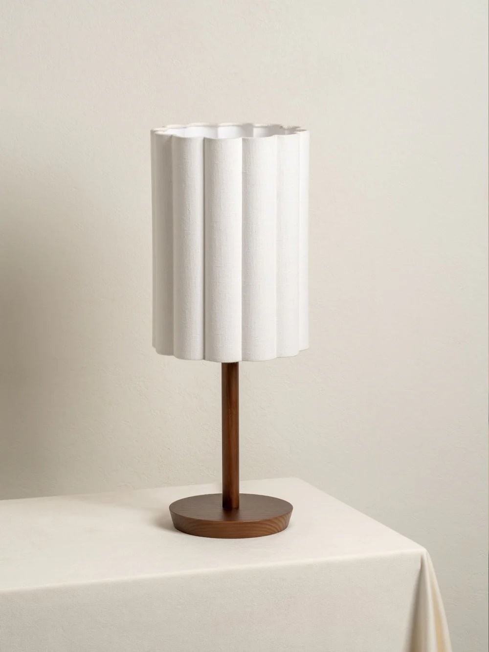 Artistic and elegant. Combining an elegant linen shade with a walnut base, the Folia collection embraces an artisanal spirit, featuring a fluted linen design that brings an organic and handcrafted touch to each piece. The walnut-coloured wood has a beautiful grain and looks gorgeous with its contrasting linen shade, which accentuates the natural grain of the walnut.