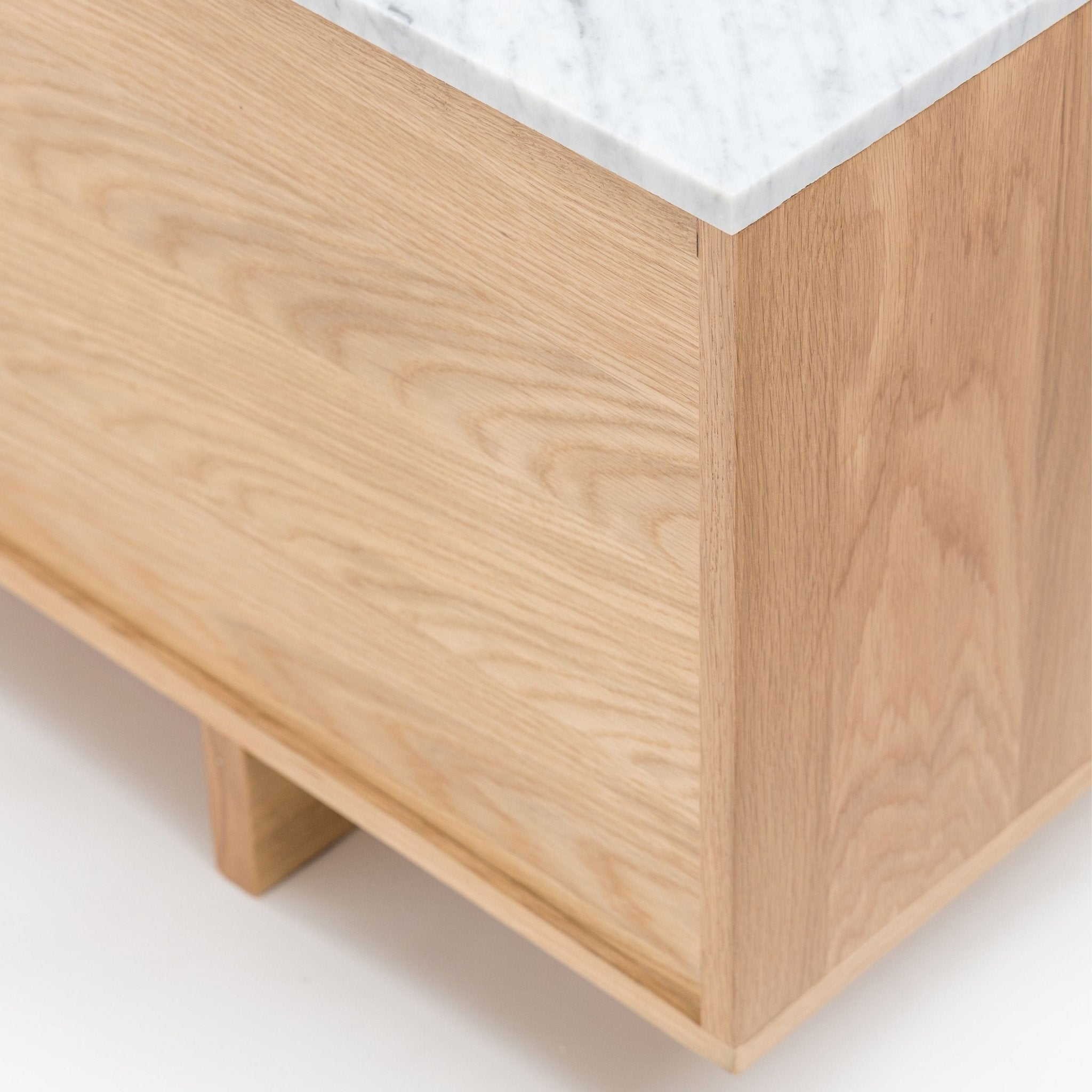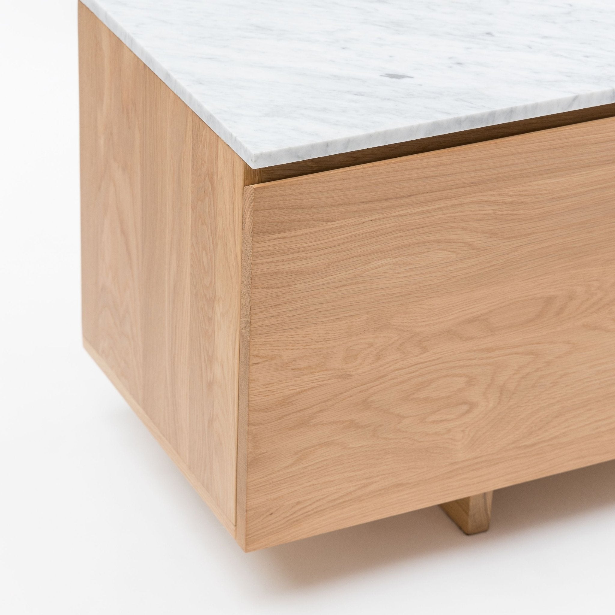 Solidity and practicality are themes of the Kami cabinets. Thick planks join together in a minimalist, unadorned style; generous storage spaces are framed by a clean, linear form boiled down to the essentials. A timber plinth base grounds the reassuringly chunky form. Solid oak or natural stone can be selected for the top panel.