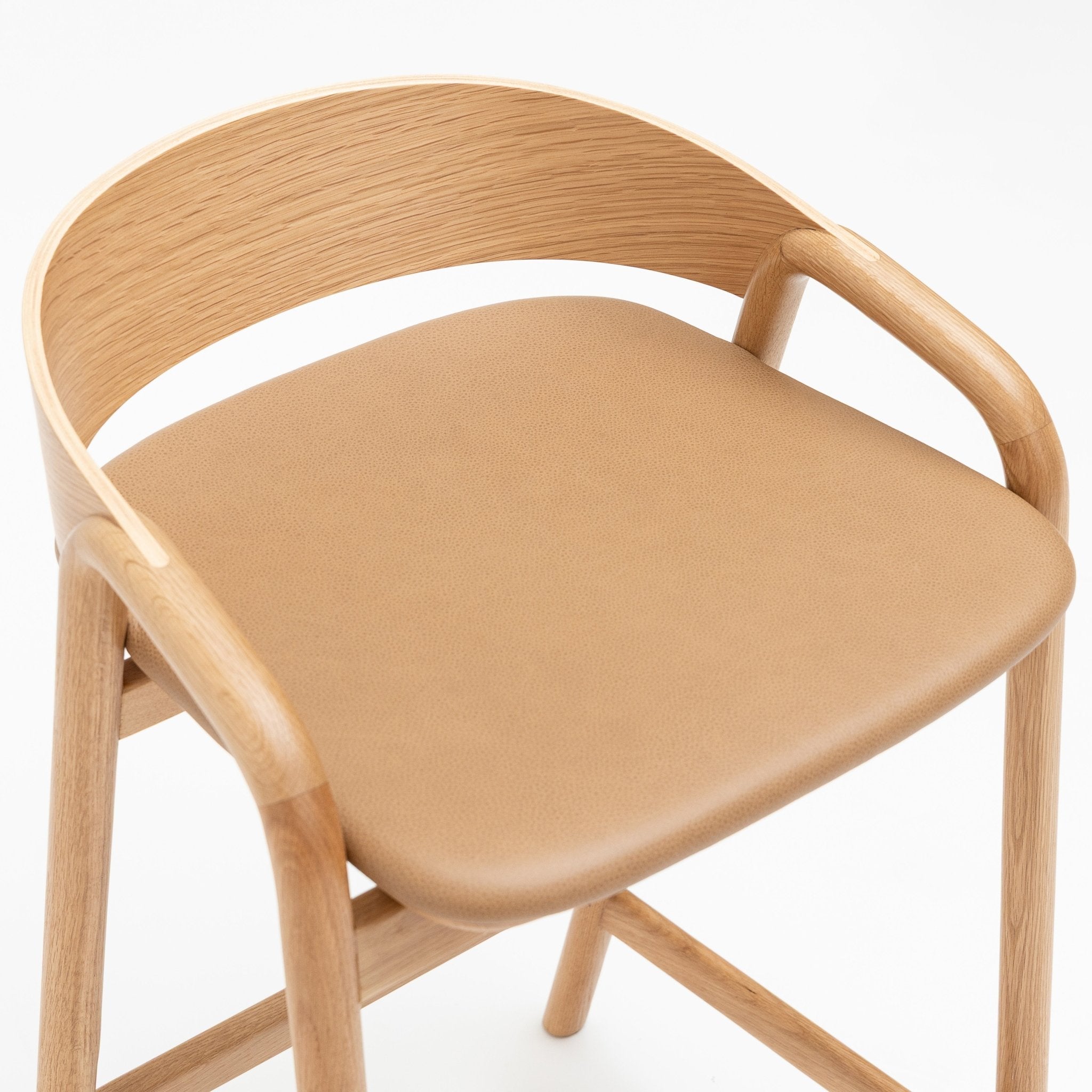 The design for Ryota Yokozeki’s Inlay counter chair comes from a desire to achieve new and challenging forms in wood while still showing respect for the material. Similar to an elegant letter form, the chair has a curving plywood backrest that merges seamlessly with the solid wood arms and frame. It’s available with an upholstered or wood seat.