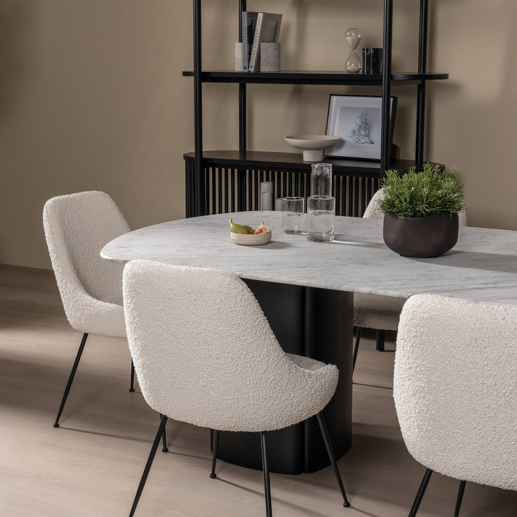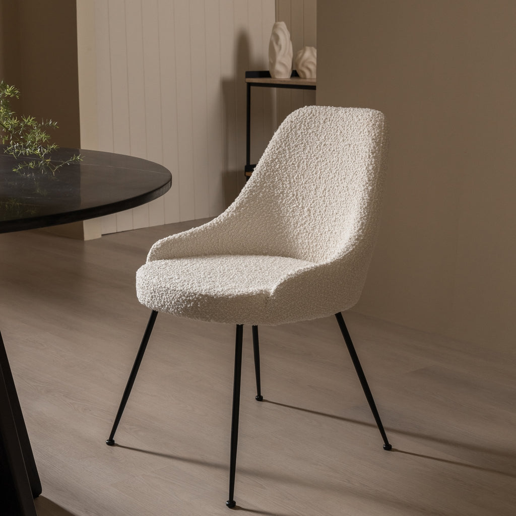 Elegant and sophisticated, the Albany is a dining chair perfect for formal dining rooms. Its sloping shape, soft textured fabric finish, and black powder-coated legs add texture and glamour to any home.