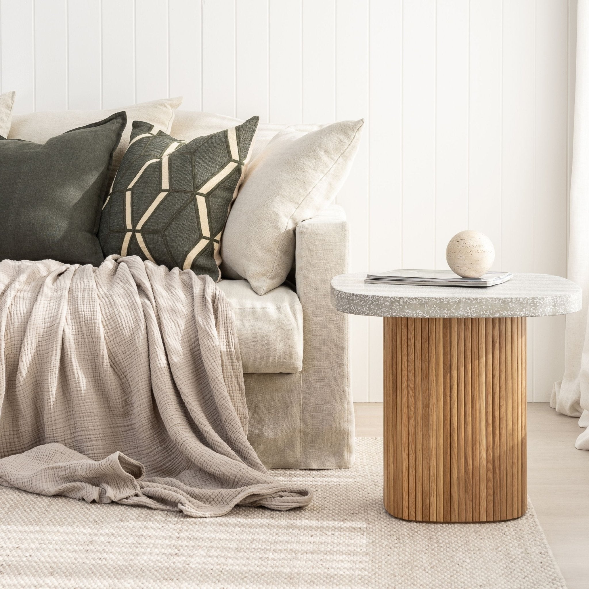 Made sustainably with Certified Solid Oak wood and a handmade concrete terrazzo stone top.